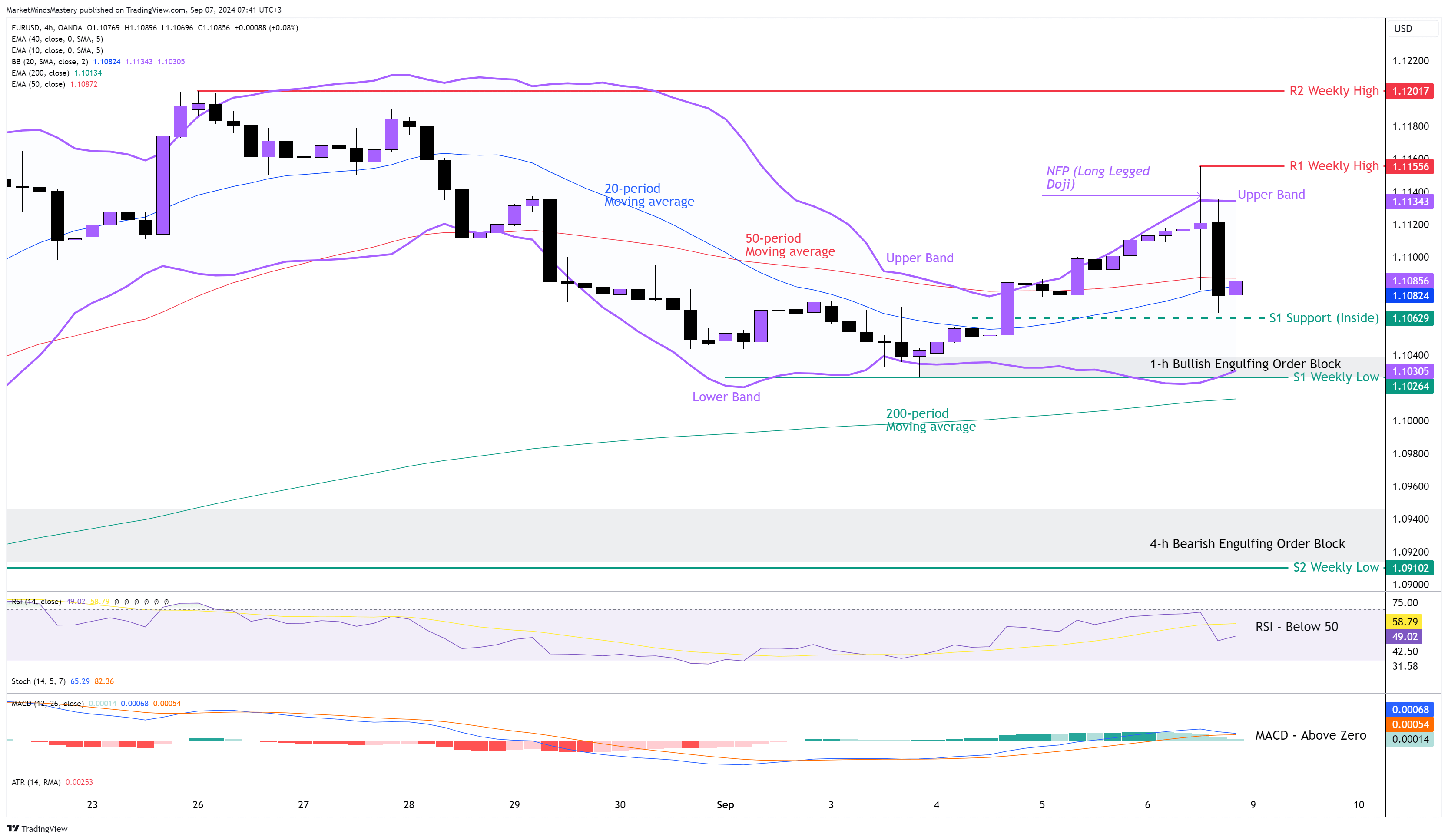 Bir önceki haftanın Piyasa Görünümünü takiben, EURUSD döviz çiftinin fiyatı S1 haftalık düşük seviyesinden destek buldu, ardından sıçradı ve grafiklerde işaret ettiğimiz Emir Bloğu ve FVP (Adil Değer Fiyatı) alanına doğru yukarı doğru hareket etti. Geçen hafta haftalık grafikteki fiyat hareketi bir Ters Çekiç ve aynı zamanda bir Çift İç mum (Boğa Marubozu'nun) olarak sona erdi. 4 saatlik grafikte fiyat, NFP duyurusunun ardından Bollinger Band göstergesinin Üst Bandını reddederek bir Uzun Bacaklı Doji mum yazdırdı. 20 periyotluk dönem 50 periyotluk hareketli ortalamanın altında ve bu düşüş eğilimi gösteriyor. RSI Osilatörü orta çizgisi olan 50'nin altındadır ve bu bir düşüş göstergesidir. MACD yükselişe işaret eden sıfır çizgisinin üzerine çıktı. Pazartesi gününden itibaren, fiyat 50 dönemlik hareketli ortalamanın altında kalır ve aşağı doğru hareket ederse, ilk destek alanı 1.10629 civarında bir İç destek, S1 olacaktır. Fiyat S1'e nüfuz eder ve daha da düşerse, bir sonraki destek olan S2, bir önceki haftanın en düşük seviyesi olan yaklaşık 1.10264 olacaktır. Bu seviye, Bollinger Band göstergesinin Alt Bandı ve saatlik grafikte bulunan Bullish Engulfing Order Block ile bir arada bulunduğu için önemli kabul edilir. Fiyat S2'ye nüfuz eder ve düşmeye devam ederse, bir sonraki destek alanı olan S3, 1.09102 civarında eski bir haftalık düşük olacaktır.