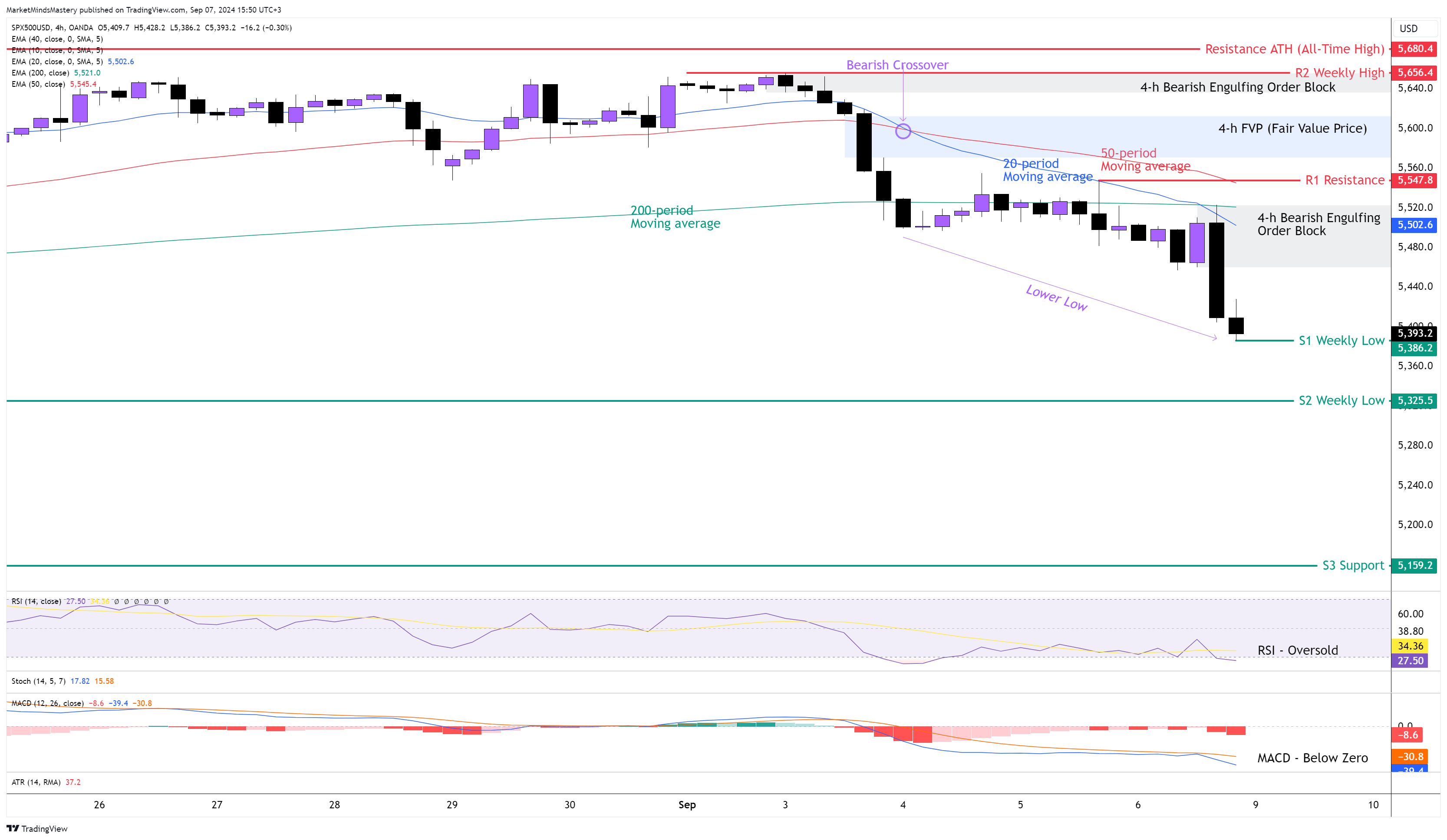 Geçen hafta haftalık grafikteki ters fiyat hareketinin ardından US500'ün fiyatı düşerek bir Ayı Yutan Ters mum çubuğu formasyonu oluşturdu. Ancak 4 saatlik grafikte, fiyat daha düşük bir tepe ve daha düşük bir dip formasyonu olarak ortaya çıktı ve bir düşüş trendinin başladığını gösterdi. 20 periyotluk dönem, 50 periyotluk hareketli ortalamanın altında ve bunun düşüş yönünde etkileri var. RSI Osilator, piyasadaki satış emrinin gücünü gösteren bir Aşırı Satım durumundadır. Ayrıca, MACD sıfır çizgisinin altındadır, bu da fiyatların hızla düştüğü anlamına gelir. MACD'nin Histogramı MACD'nin orta çizgisinin altındadır ve bunun düşüş yönünde etkileri vardır. Pazartesi gününden itibaren, fiyat aşağı doğru hareket etmeye devam ederse, ilk destek alanı olan S1, önceki haftanın en düşük seviyesi olan 5386 $ civarında olacak. Fiyat S1'i aşar ve aşağı doğru hareket etmeye devam ederse, bir sonraki destek alanı olan S2, 5325 $ civarında eski bir haftanın en düşük seviyesi olacak. Daha da düştükçe ve aşağı doğru hareket etmeye devam ettikçe, bir sonraki destek alanı olan S3'ü yaklaşık 5159 $ bulur.