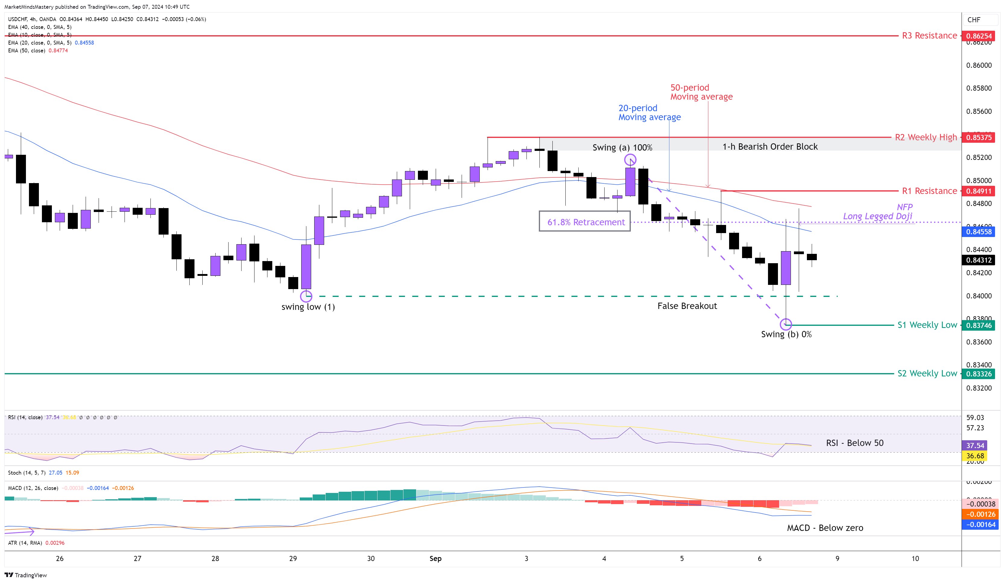 ABD Dolarının geçen haftaki genel gücüne rağmen, İsviçre Frangı (CHF'nin kısaltması) güç kazanmaya devam etti ve Döviz Korelasyonu analizine göre, USD'den çok daha güçlüydü. Bu nedenle, geçen Salı gününden bu yana USDCHF'nin fiyatı düşüyor. Haftalık grafikte, fiyat bir Ayı Yutan Tersine Çevirme candlestick olarak sona erdi. 4 saatlik grafiğe bakıldığında, fiyat beklendiği gibi geriledi ve grafikte gösterildiği gibi düşük salınım noktasında (1), fiyat geçen Cuma günü bunun altında kapanamadı. Geçtiğimiz Salı günü, fiyat 0,8530 civarında bir Ayı Emir Bloğu oluşturdu. Hareketli ortalama analizine göre, 20 periyot 50 periyodun altında, ve bu düşüş eğilimi gösteriyor. NFP fiyatın 20 dönemlik hareketli ortalamayı ve (a) noktasından (b) noktasına %61,8 Fibonacci gerilemesini reddeden bir Uzun Bacaklı Doji candle oluşturmasına neden oldu ve bunun aşağı yönlü etkileri var. RSI Osilatörü orta çizgisi olan 50'nin altındadır ve bu düşüş eğilimindedir. MACD sıfır çizgisinin altında, bu da düşüşe işaret ediyor.