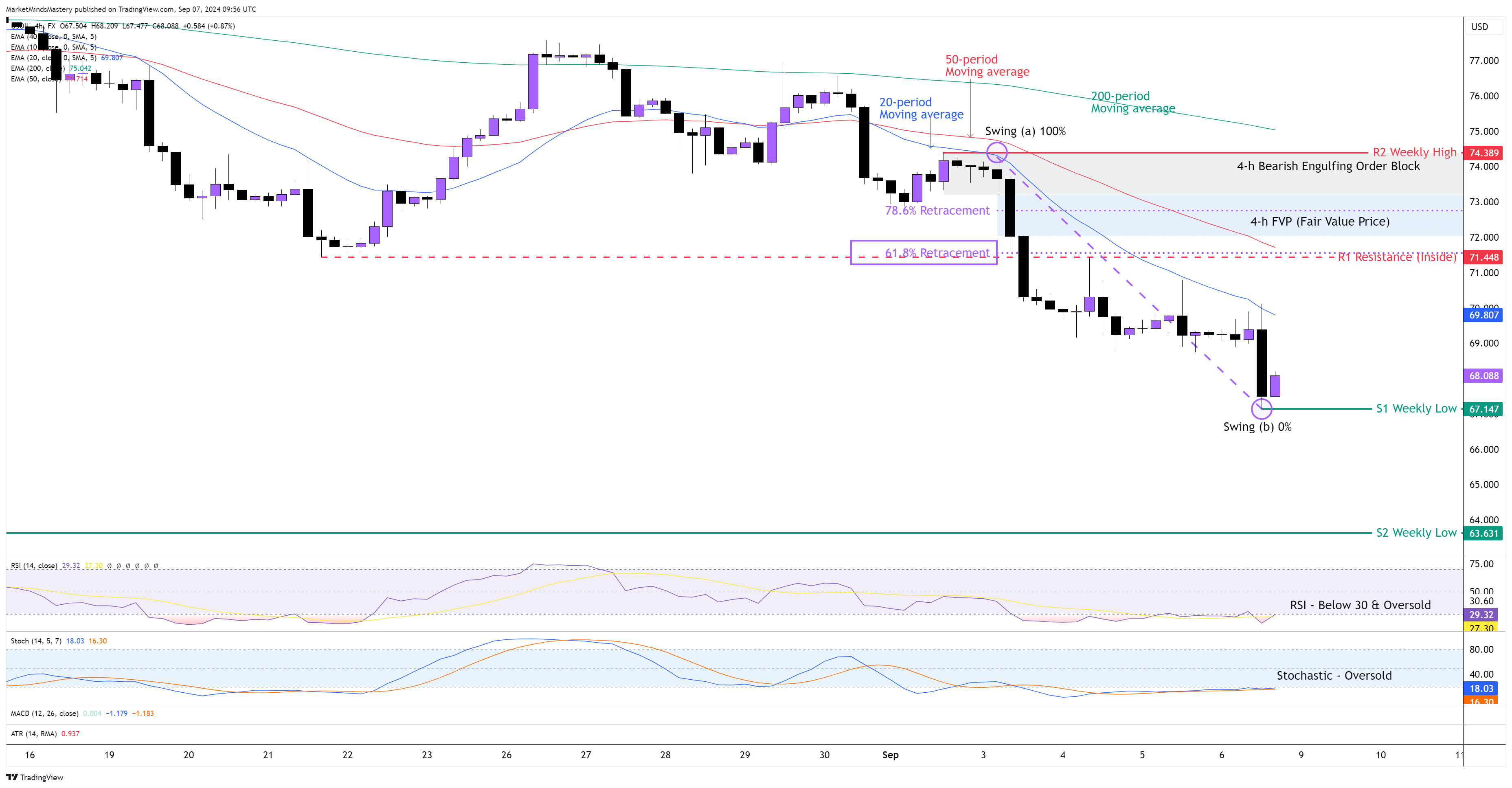 Önceki haftaki piyasa hareketinin ardından USOIL fiyatı, haftalık grafikteki ana düşüş trendi ve aynı grafikteki Ayı dönüşü fiyat hareketi nedeniyle beklendiği gibi aşağı yönlü hareketini sürdürdü. Geçen hafta, haftalık mum Uzun, Ayı mumu olarak sona erdi. 4 saatlik grafikte fiyat, ana düşüş trendini takiben bir düşük tepe ve düşük dip oluşumu yarattı. 20 periyotluk hareketli ortalama 50 periyotluk hareketli ortalamanın altında ve aynı zamanda 50 periyotluk hareketli ortalama 200 periyotluk hareketli ortalamanın altında ve bunun ayı etkileri var. Geçtiğimiz Salı gününden bu yana, her iki Osilatör, RSI ve Stochastic, New York işlem seansı sırasında USOIL piyasasında meydana gelen hızlı ve hızlı aşağı yönlü hareket nedeniyle Aşırı Satım durumuna girdi. Aynı gün, fiyat 72$ civarında bir FVP (Fair Value Price) ve 74$ civarında 4 saatlik bir Bearish Engulfing Order Block oluşturdu. Fiyat aşağı doğru hareket etmeye devam ederse, ilk destek alanı olan S1, önceki haftanın en düşük seviyesi olan 67,14$ civarında olacak. Fiyat S1'e nüfuz eder ve daha da düşerse, bir sonraki destek seviyesi olan S2, daha eski bir haftalık düşük fiyat seviyesi olan 63,63 $ civarında olacaktır. Tersine, fiyat S1 seviyesinden sıçrarsa, geri çekilme seviyelerini tahmin etmek için Fibonacci düzeltme aracını (a) noktasındaki salınımdan (b) noktasındaki salınıma kadar kullanabiliriz. Grafikte gösterildiği gibi, %61,8 Altın Oran, 71,44 $ civarındaki R1 İç direnç ve 50 dönemlik hareketli ortalamadan oluşmaktadır. Fiyat R1'e nüfuz eder ve artmaya devam ederse, bir sonraki direnç alanı olan R2, önceki haftanın en yüksek seviyesi olan 74,38 $ civarında olacaktır.