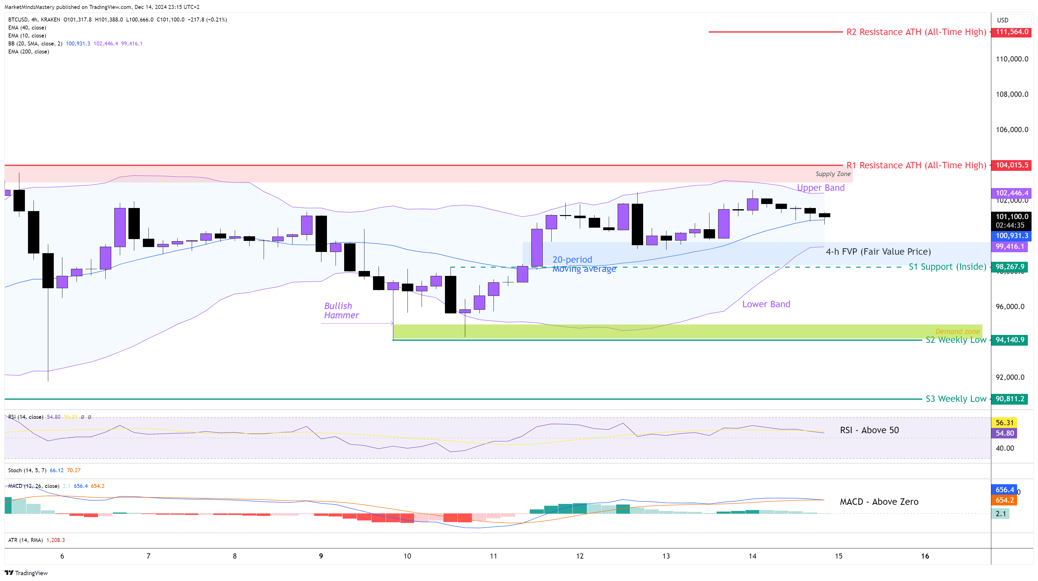 Önceki piyasa analizine göre, haftalık grafikte Bitcoin fiyatı, neredeyse Gravestone Doji mum çubuğu formasyonuna benzer şekilde, küçük gövdeli bir Doji mum çubuğu olarak sona erdi. Geçen hafta fiyat, bir önceki haftalık mumun en yüksek ve en düşük sınırları içinde kaldı. Bu nedenle, 4 saatlik grafikte fiyat yanlara doğru veya bir ticaret aralığı içinde hareket etti. Bollinger Bantları göstergesini kullanırsak, geçen Pazartesi fiyatın 95.000$ civarında bir Bullish Hammer oluşturduğunu ve grafikte gösterildiği gibi Alt Bandın altında kırıldığını görüyoruz. Ancak ertesi gün fiyat aynı seviyeyi tekrar test ederek bir Çift Dip formasyonu oluşturdu. Daha sonra sıçradı ve yukarı doğru hareket ederek göstergenin Üst Bandına ulaştı. Fiyat geçtiğimiz Salı günü yaklaşık 94.500 $'lık bir Talep Bölgesi ve geçtiğimiz Çarşamba günü yaklaşık 99.000 $'lık bir FVP (Adil Değer Fiyatı) oluşturdu. RSI Osilatörü 50'nin üzerinde, bu da yükselişe işaret ediyor. MACD sıfır çizgisinin üzerinde ve bu yükselişe işaret ediyor. Ayrıca, MACD Histogramı pozitiftir ve yükselişe işaret eder. Şu anda fiyat, Bollinger Bandının orta çizgisi olan 20 dönemlik hareketli ortalamanın üzerinde ve bunun yükseliş etkileri var. Fiyat yukarı doğru hareket etmeye devam ederse, ilk direnç alanı olan R1, ATH (Tüm Zamanların En Yüksek Seviyesi) olan 104.015 $ 'da olacaktır. Fiyat R1 direncini aşar ve yukarı doğru hareket etmeye devam ederse, bir sonraki direnç alanı olan R2, grafikte gösterildiği gibi % 161,8 Fibonacci Uzantısı kullanılarak tahmin edilen yeni ATH olan 111.564 $ civarında olacaktır. Öte yandan, fiyat reddedilir ve aşağı doğru hareket ederse, ilk destek alanı olan S1, yaklaşık 98.267 $ 'lık bir İç Destek olacaktır. Fiyat S1'e nüfuz eder ve aşağı doğru hareket etmeye devam ederse, bir sonraki destek alanı olan S2, önceki haftanın en düşük seviyesi olan 94.140 $ seviyesinde olacaktır.