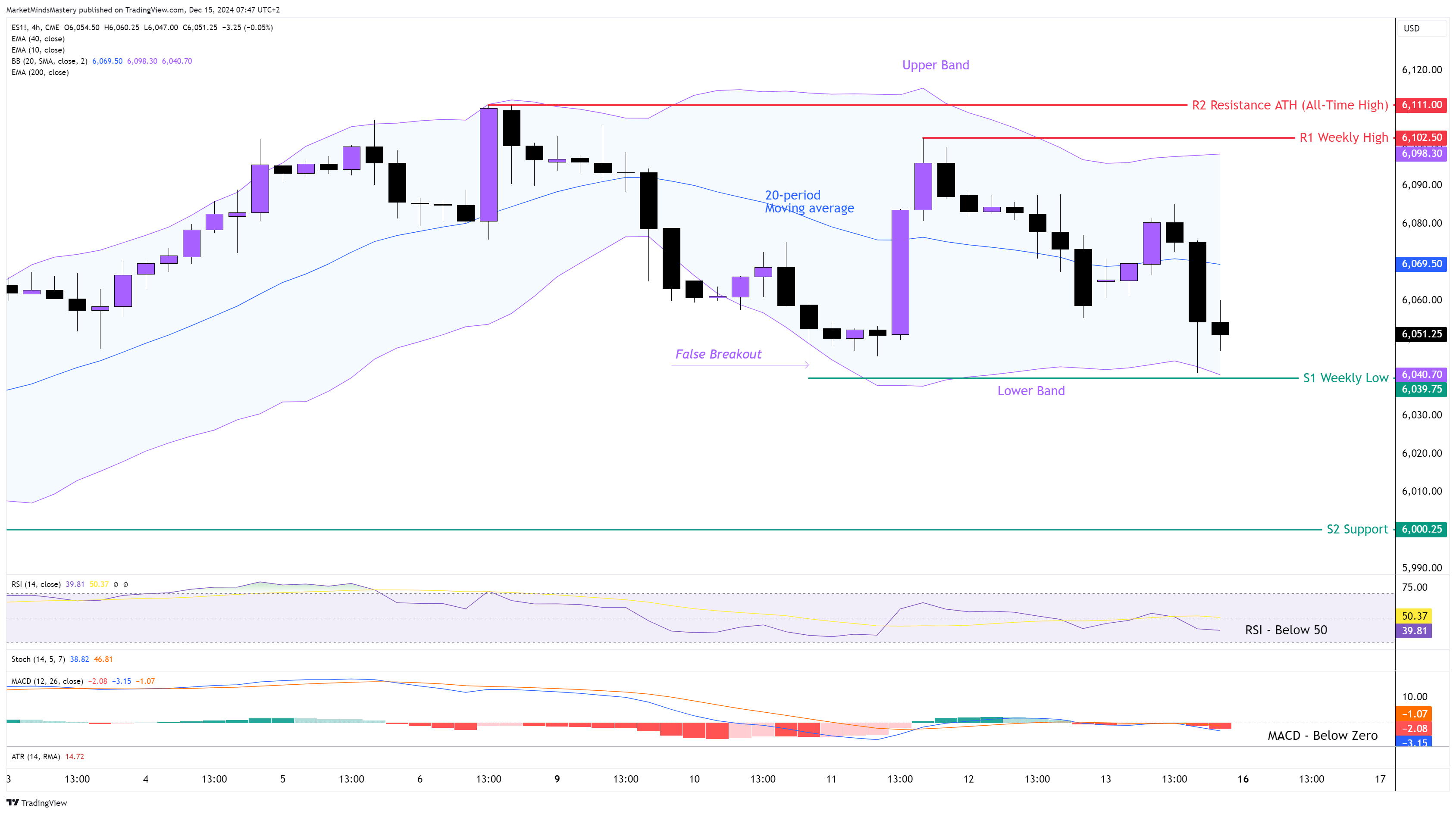 Bir önceki haftanın piyasa analizinin ardından, S&P 500'ün fiyatı 6.1111 $ olan ATH (Tüm Zamanların En Yüksek) seviyesinin altında kaldı. Geçen hafta, haftalık grafikteki fiyat iç Ayı mumu olarak sona erdi. 4 saatlik grafikte, Bollinger Bandı göstergesini kullanırsak, fiyatın Salı günü Alt Bant'ta bir Yanlış Kırılma yarattığını ve o zamandan beri Alt ve Üst Bant içinde işlem gördüğünü görüyoruz. Şu anda fiyat, Bollinger Band göstergesinin orta çizgisi olan 20 dönemlik hareketli ortalamanın altında ve bunun düşüş yönünde etkileri var. RSI Osilatörü orta çizgisi olan 50'nin altında ve bu düşüş eğilimi gösteriyor. Ek olarak, MACD'nin Histogramı MACD Çizgisi (Mavi) Sinyal Çizgisinin (Turuncu) altından geçtiği için düşüyor ve bu da kısa vadeli fiyat hareketinde düşüşe işaret ediyor. Bu nedenle, fiyat aşağı doğru hareket ederse, ilk destek alanı olan S1, bir önceki haftanın en düşük seviyesi olan 6039,75 $ 'da olacaktır. Fiyat S1'e nüfuz eder ve aşağı yönlü hareket etmeye devam ederse, bir sonraki destek alanı olan S2, 6.000,25 $ seviyesinde olacaktır.