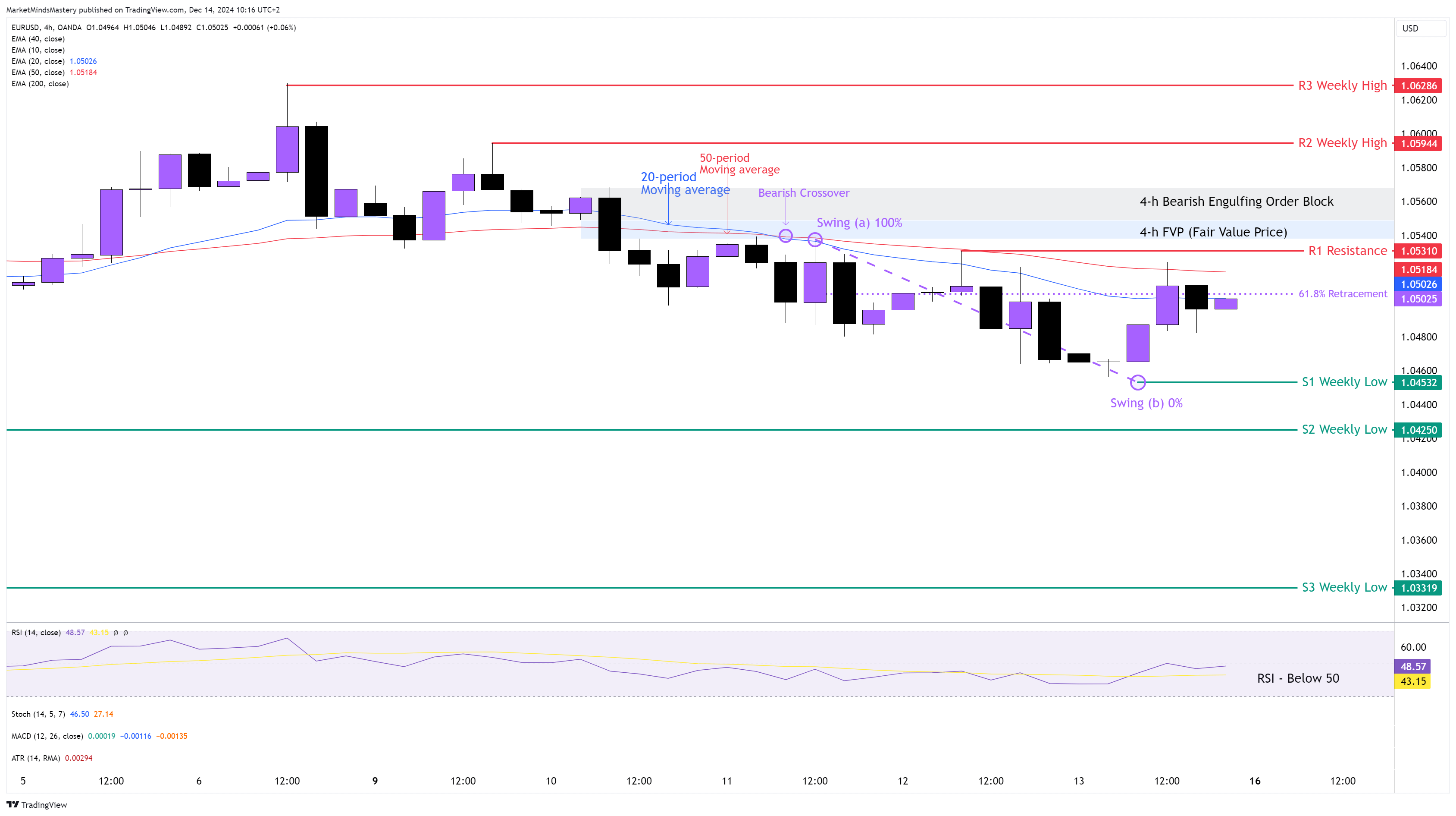 Bir önceki haftanın Piyasa Görünümünün ardından, haftalık grafikte EURUSD fiyatı Ayı Mumu olarak sona erdi ve belirgin Üst ve Alt fitiller bıraktı. Birincil trend düşüş trendidir. Ancak, mum çubuğu analizi trendin zayıfladığını gösteriyor. 4 saatlik grafikte, fiyat aşağı yönlü hareket etmeye devam ederek bir dizi düşük tepe ve düşük dipler oluşturdu. Geçtiğimiz Çarşamba günü, 20 periyotluk hareketli ortalama, Ayı Geçişi olarak bilinen 50 periyotluk hareketli ortalamanın altından geçti ve bunun düşüş yönünde etkileri var. RSI Osilatörü, düşüş eğilimi gösteren orta çizgisi olan 50'nin altında. Şu anda fiyat, Fibonacci'nin %61,8 Altın Oranı civarında seyrediyor ve grafikte gösterildiği gibi (a) noktasından (b) noktasına olan salınımı ve 1,05025 seviyesindeki 20 dönemlik hareketli ortalamayı ölçüyor. Bu nedenle, fiyat düşer ve aşağı doğru hareket ederse, ilk destek alanı olan S1, bir önceki haftanın en düşük seviyesi olan 1,04532'de olacaktır. Fiyat S1'e nüfuz eder ve aşağı doğru hareket etmeye devam ederse, bir sonraki destek alanı olan S2, daha eski bir haftalık seviye olan 1.04250'de olacaktır. Fiyat S2'yi aşar ve aşağı doğru hareket etmeye devam ederse, bir sonraki destek alanı olan S3, 1.03319 civarında olacaktır.