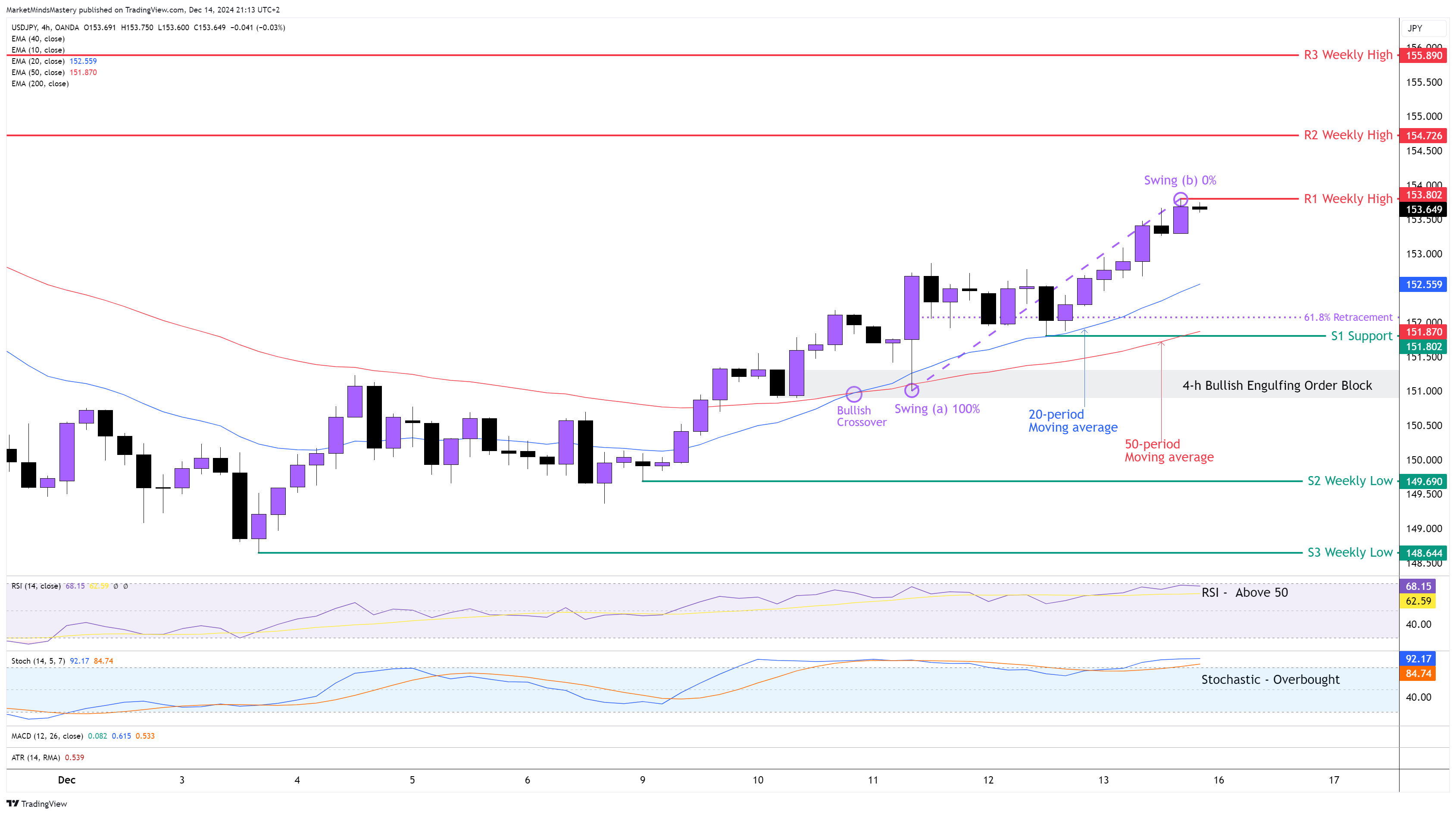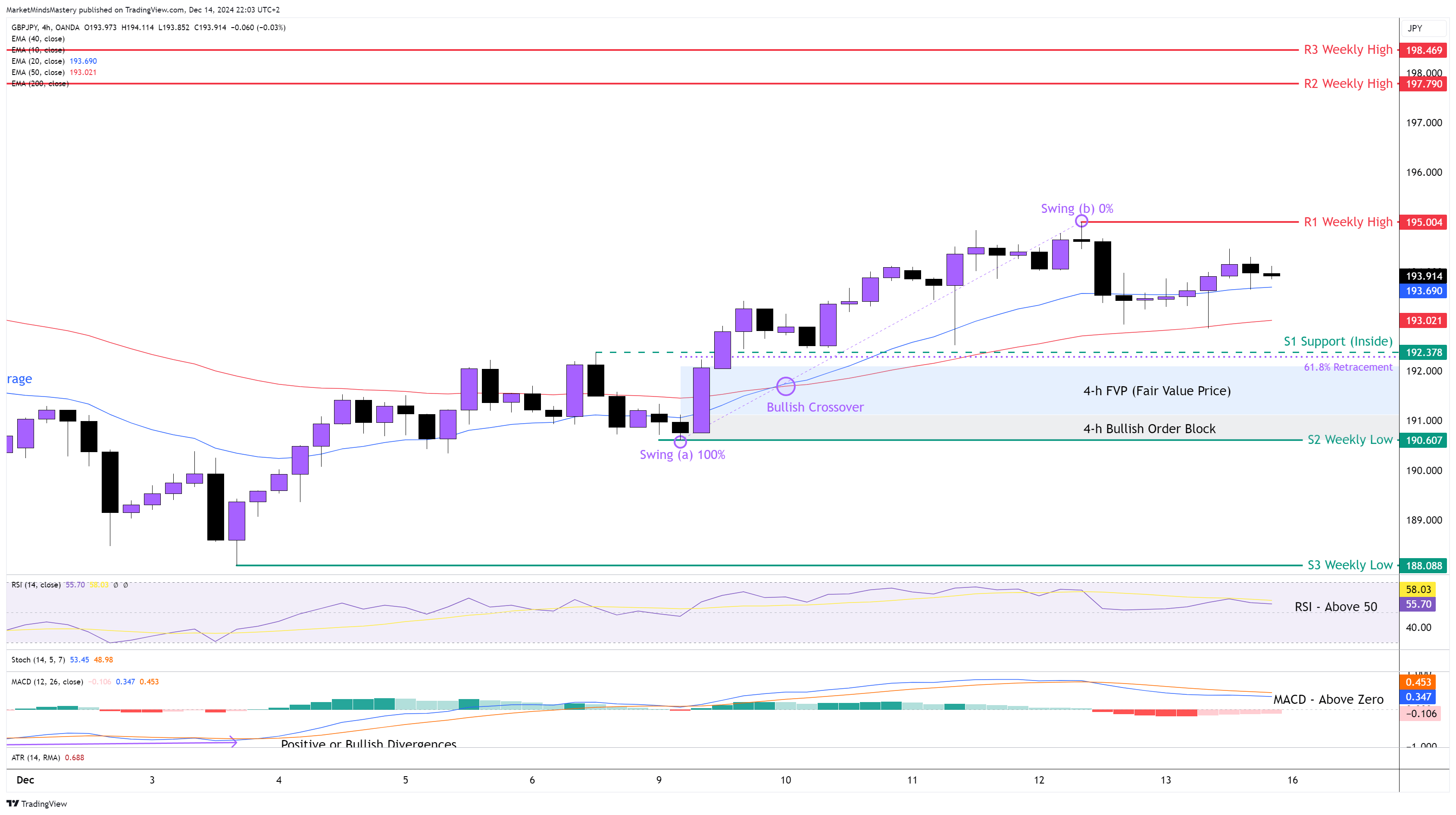 Bir önceki haftanın piyasa görünümünün ardından, Uzun Bacaklı Doji mumu fiyatı yukarı doğru hareket etmeye zorladı. Haftalık grafik, 10 periyotluk haftalık hareketli ortalamanın (grafikte gösterilmemiştir) üzerinde kapanarak bir Bullish Continuation mumu olarak sona erdi. 4 saatlik grafikte, geçtiğimiz Salı günü 20 periyot, Bullish Crossover olarak bilinen 50 periyot hareketli ortalamanın üzerine çıktı. Fiyat o zamandan beri yukarı doğru hareket etmeye başladı ve daha yüksek zirveler ve daha yüksek dipler yarattı. Geçtiğimiz Pazartesi günü, fiyat 190.800 civarında bir Bullish Order Block oluşturdu. Bu fiyat davranışı, RSI Osilatörünün 50'lik orta çizginin üzerinde olmasına yol açarak Yükselişe işaret ediyor.