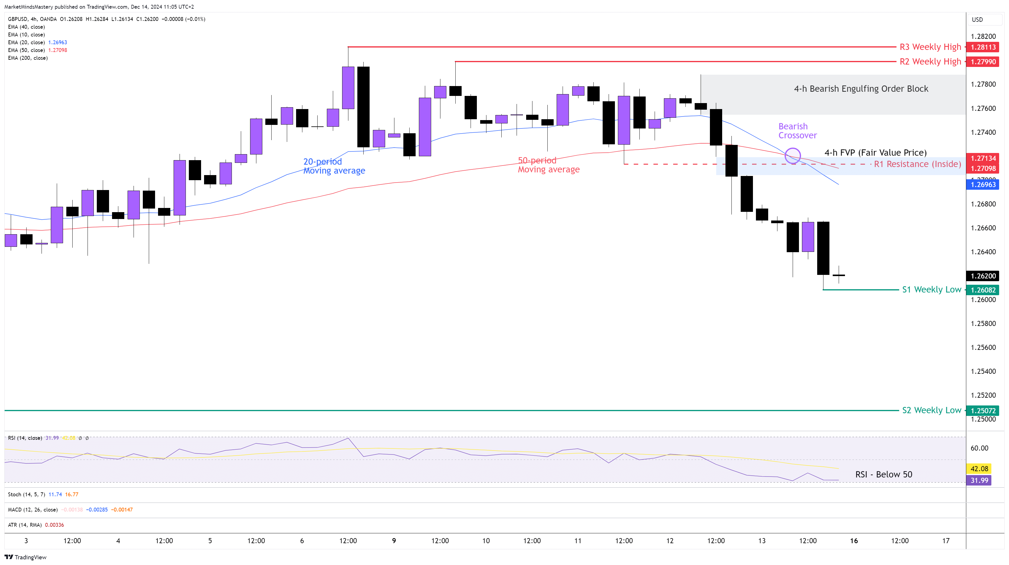 Öte yandan, fiyat sıçrar ve yukarı doğru hareket ederse, ilk direnç alanı olan R1, 1.27134 civarında bir İç Direnç olacaktır. Bu, geçen Perşembe günü oluşturulan FVP (Adil Değer Fiyatı) ve 50 dönemlik hareketli ortalamadan oluştuğu için önemli bir direnç seviyesi olarak kabul ediliyor. Fiyatın R1'i aşması ve artmaya devam etmesi durumunda, bir sonraki direnç alanı olan R2, bir önceki haftanın en yüksek seviyesi olan 1,27990 civarında olacak. Bu aynı zamanda bir başka önemli direnç seviyesidir, çünkü biraz altında geçen Perşembe günü oluşturulan ve ticaret aralığının kırılmasına neden olan Bearish Engulfing Order Block vardır. Bu nedenle, fiyata ek bir direnç olarak hareket edebilir.