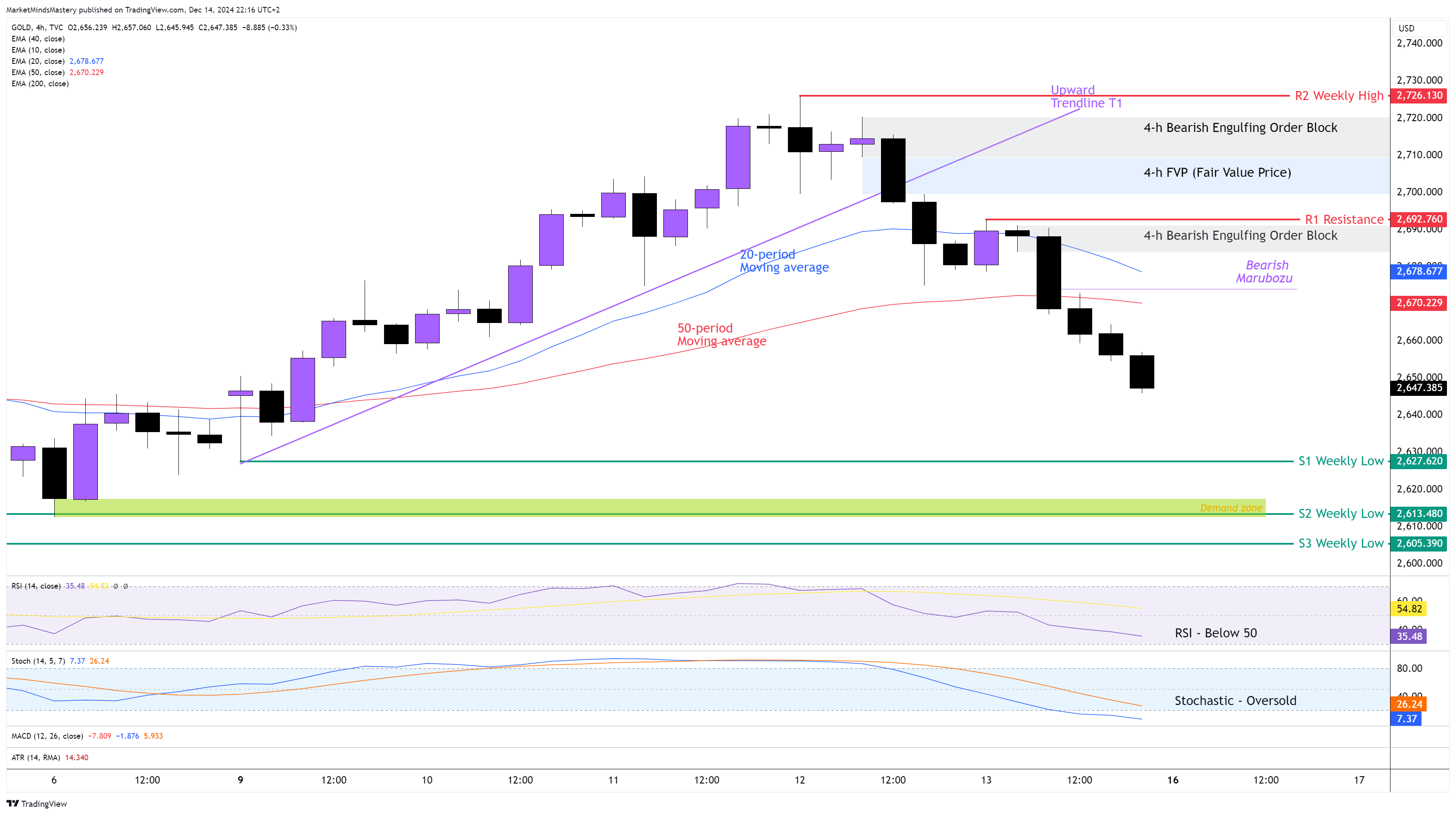 Öte yandan, fiyat sıçrar ve yukarı doğru hareket ederse, ilk direnç alanı R1 2692 $ civarında olacaktır. Bu, Yutan Ayı Emir Bloğu ve 20 dönemlik hareketli ortalama ile bir arada bulunduğu için önemli bir direnç seviyesi olarak kabul edilir. Fiyat R1'e nüfuz eder ve yukarı doğru hareket etmeye devam ederse, bir sonraki direnç alanı olan R2, önceki haftanın en yüksek seviyesi olan 2726 $ civarında olacaktır.