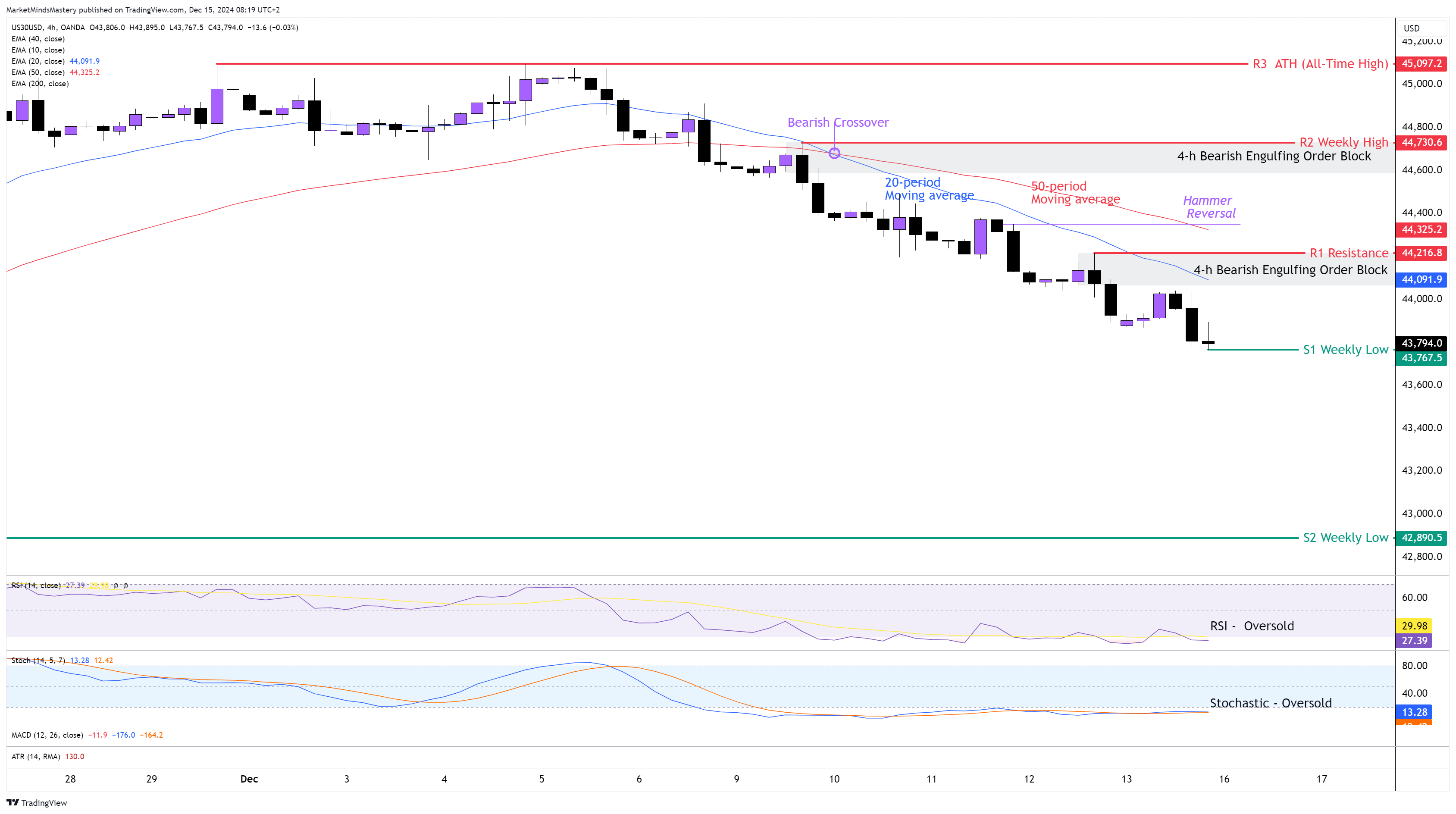US30, üst üste ikinci hafta da üç büyük ABD endeksi arasında en zayıf endeks oldu. Bir önceki haftanın Piyasa Analizinin ardından, haftalık grafik bir Ayı Devamı candlestick'i olarak sona erdi. Birincil trend yükseliş trendi olmaya devam ediyor, ancak daha düşük zaman dilimlerinde güçlü bir düşüş trendi gelişiyor. 4 saatlik grafikte, geçtiğimiz Pazartesi günü New York işlem seansı sırasında fiyat 44.600$ civarında bir Ayı Yutan Emir Bloğu oluşturdu. Ayrıca, geçtiğimiz Perşembe günü fiyat 44.100$ civarında bir Ayı Yutan Emir Bloğu daha oluşturdu. Fiyat 20 dönemlik hareketli ortalamanın altında işlem görüyordu ve bu da piyasada güçlü bir düşüş trendinin gelişmekte olduğunu gösteriyordu. 20 periyot, 50 periyot hareketli ortalamanın altında kalmaya devam ediyor ve bu düşüş eğilimi anlamına geliyor. RSI Osilatörü neredeyse Aşırı Satım durumunda ve bu da düşüş eğilimi gösteriyor. Stochastic Osilatör 20 alt sınırının altında, bu da Aşırı Satım durumunda olduğu anlamına geliyor. Pazartesi gününden itibaren, fiyat aşağı doğru hareket etmeye devam ederse, ilk destek alanı olan S1, bir önceki haftanın en düşük seviyesi olan 43.767 $ 'da. Fiyat S1'e nüfuz eder ve aşağı doğru hareket etmeye devam ederse, bir sonraki destek alanı olan S2, daha eski bir haftalık seviye olan 42.890 $ civarındadır.