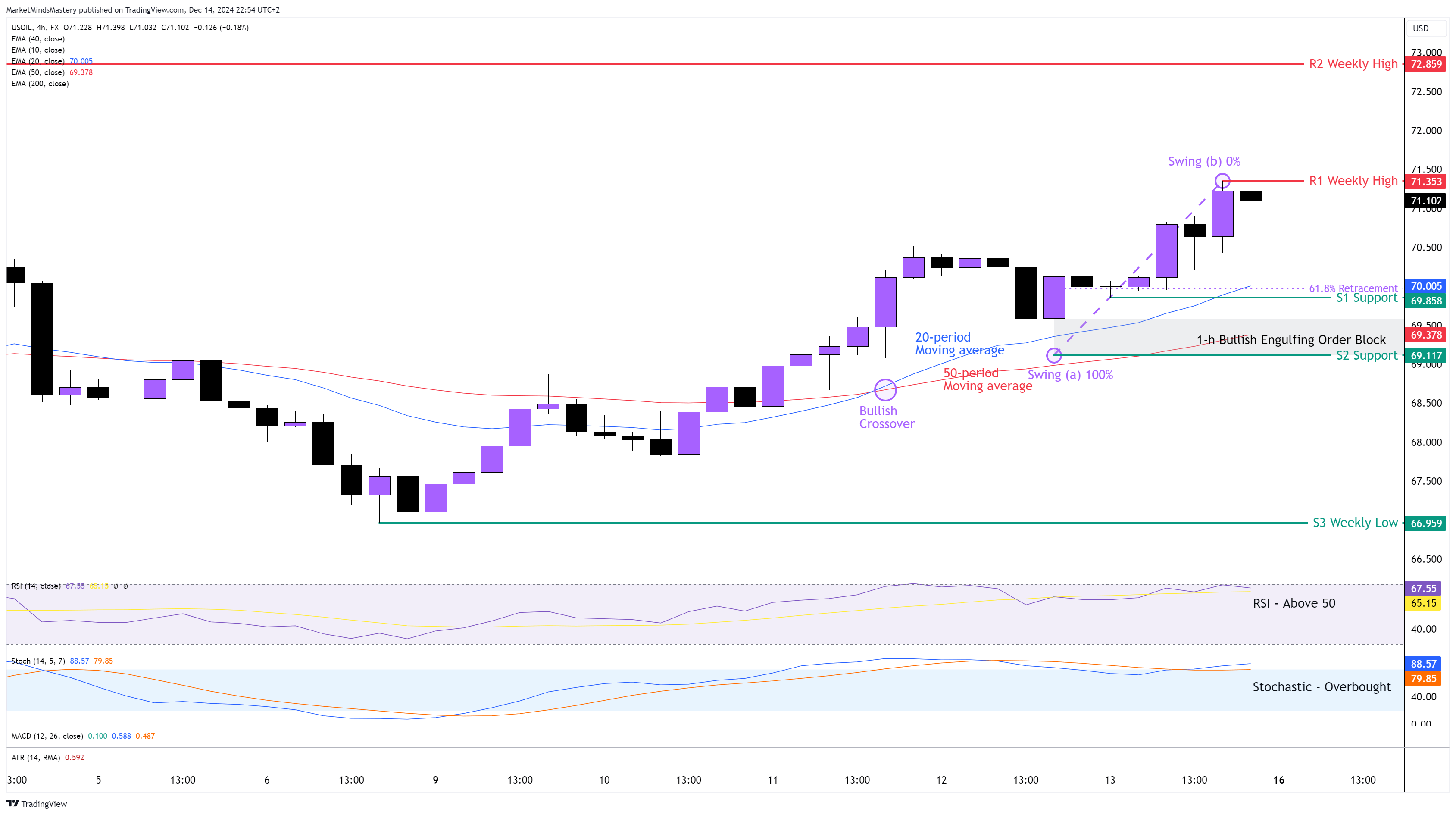 Bir önceki haftanın piyasa analizini takiben, geçen hafta haftalık grafikte açıkladığımız aşağı yönlü ters mum çubuğu devam etti ve fiyat tersine dönerek yukarı doğru hareket etti ve haftalık zaman diliminde bir Yutan Boğa ters mum çubuğu formasyonu oluşturdu. 4 saatlik grafikte fiyat bir dizi yüksek tepe ve yüksek dip yaparak yukarı yönlü hareket etti ve bir yükseliş trendine işaret etti. Geçtiğimiz Perşembe günü, fiyat 20 periyotluk hareketli ortalamayı reddetti ve saatlik zaman diliminde 69,50$ civarında bir Bullish Engulfing Order Block bırakarak yeni bir yüksek formasyon oluşturdu. Geçtiğimiz Çarşamba günü 20 periyotluk hareketli ortalama, Bullish Crossover olarak bilinen 50 periyotluk hareketli ortalamanın üzerine çıktı. RSI neredeyse bir Aşırı Alım durumunda ve ABD petrol piyasasında yükseliş gücünü gösteriyor. Aynı zamanda, Stokastik Osilatör Aşırı Alım koşullarına işaret eden üst sınırı olan 80'in üzerinde. Pazartesi gününden itibaren, fiyat yukarı doğru hareket etmeye devam ederse, ilk direnç alanı olan R1, bir önceki haftanın en yüksek seviyesi olan 71,35 $ 'da olacak. Fiyatın R1'i aşması ve yukarı doğru hareket etmeye devam etmesi durumunda, bir sonraki direnç alanı olan R2, 72,85 $ civarında olacaktır.