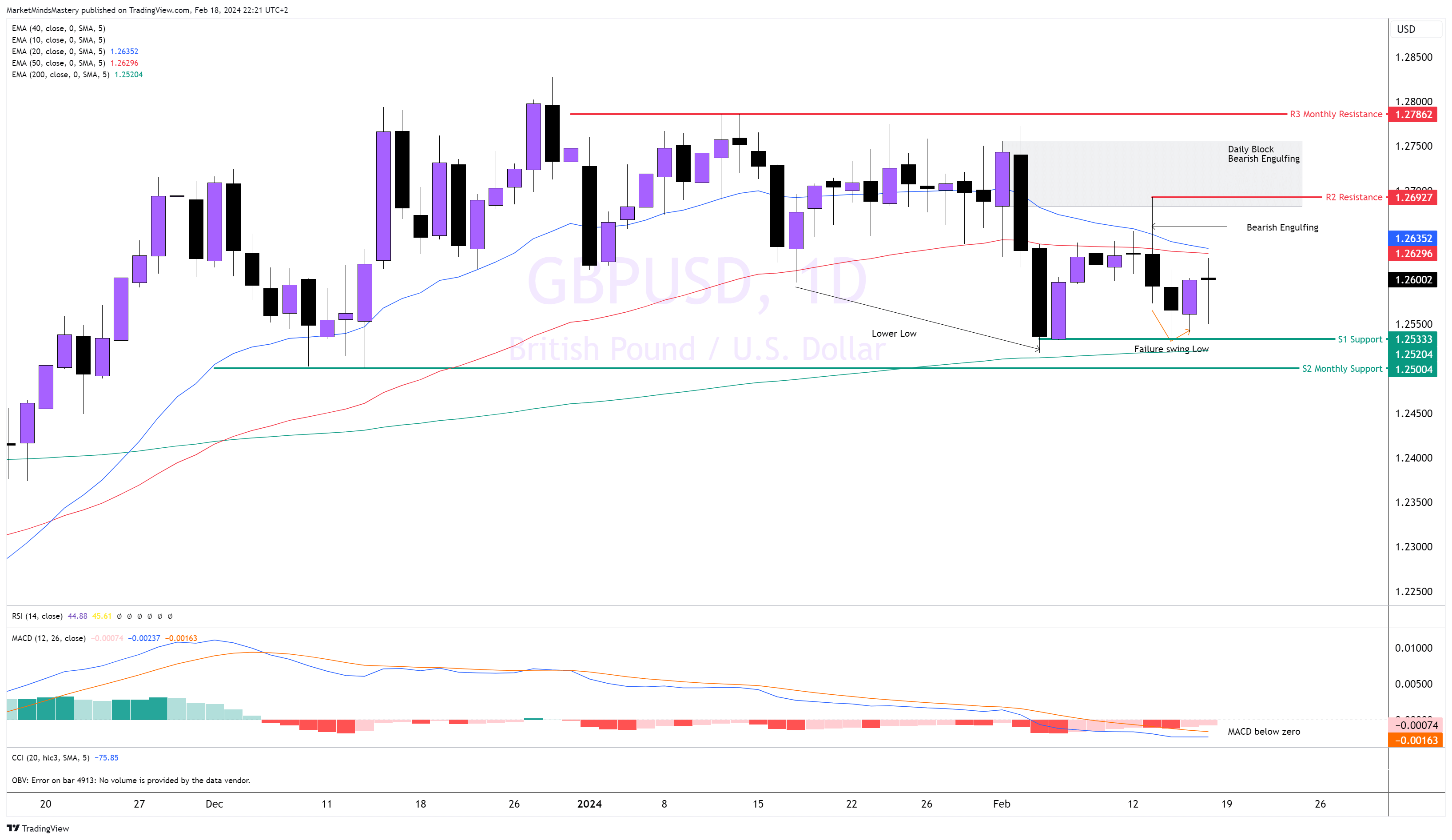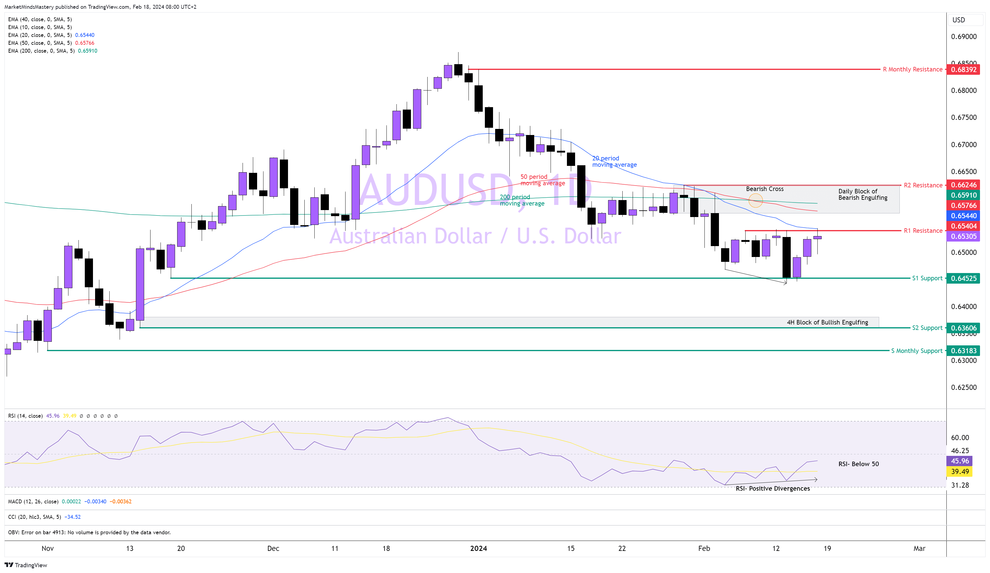 Following the CPI outcome last Tuesday, the price bounced off S1 support, around 0.64525 and moved upwards for three consecutive days. Last Friday, it reached the 20-period moving average, and the R1 resistance was approximately 0.6550. The RSI shows positive or bullish divergences, and its value is still below 50, which is a bearish indication. The price maintains its lower highs and lower lows, which is also a bearish indication.