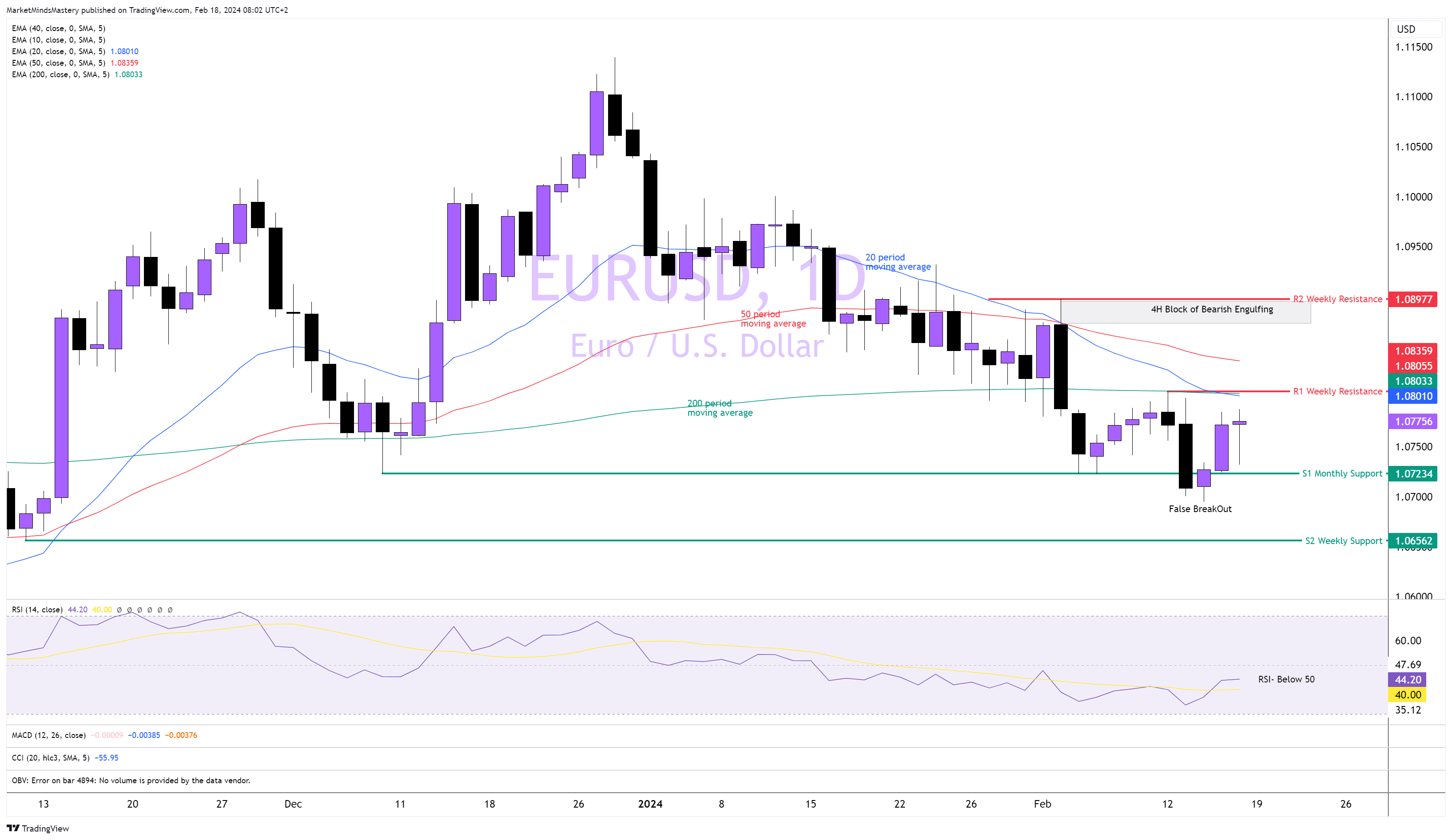 Following the bearish engulfing candle printed last Monday, the price moved lower the next day due to the market reaction after the CPI was announced in the US. A temporary boost occurred on the US dollar that didn't last long, as since last Wednesday, the market bounced off, and the price moved upwards. The market is trending downwards as the price makes lower highs and lower lows. The price is trading below all three moving averages, which is a bearish indication. The RSI is below 50, which is also a bearish indication. If the price reverses and shifts to the downside, the first support area, S1, is approximately 1.07234.