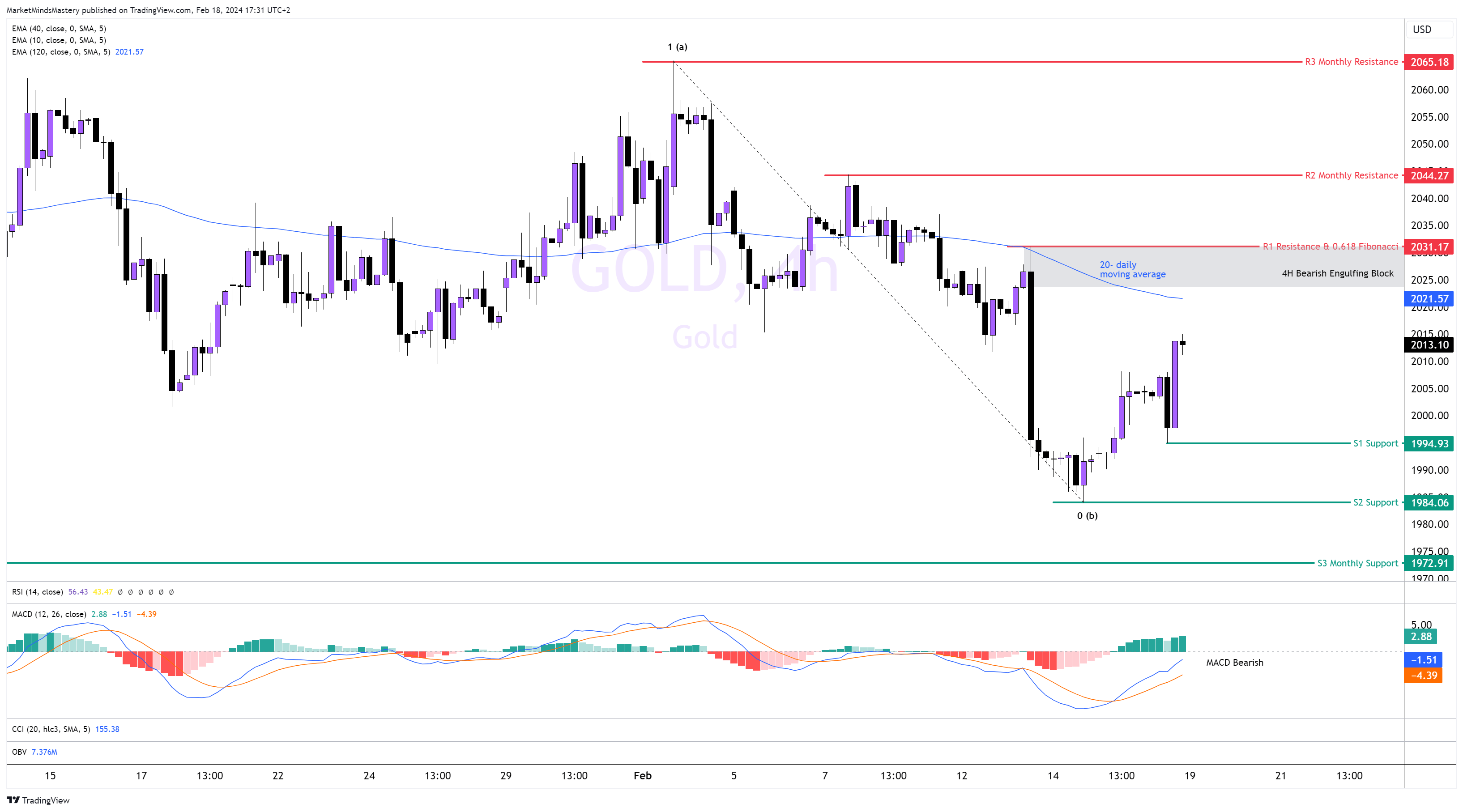 Following the long-term consolidation, last week's price of Gold, on the 4H time frame, created a lower low. Therefore, a Fibonacci retracement can be drawn from point (a) to point (b) as the price started a correction. Regarding the MACD indicator, the MACD line rose above the signal line, which is a bullish indication. However, the market is still in a defined downtrend. If the price continues moving upwards, the first resistance area can be the dynamic 20-period daily moving average. The 20 Daily MA is also in an area of a bearish engulfing block price action. The high of the bearish engulfing around 2031 is marked as the R1 static resistance and consists of the 0.618 Fibonacci golden number. If the price penetrates the R1, closes above it and moves higher, the next area of resistance, R2, will be approximately 2044, which is also a monthly level.