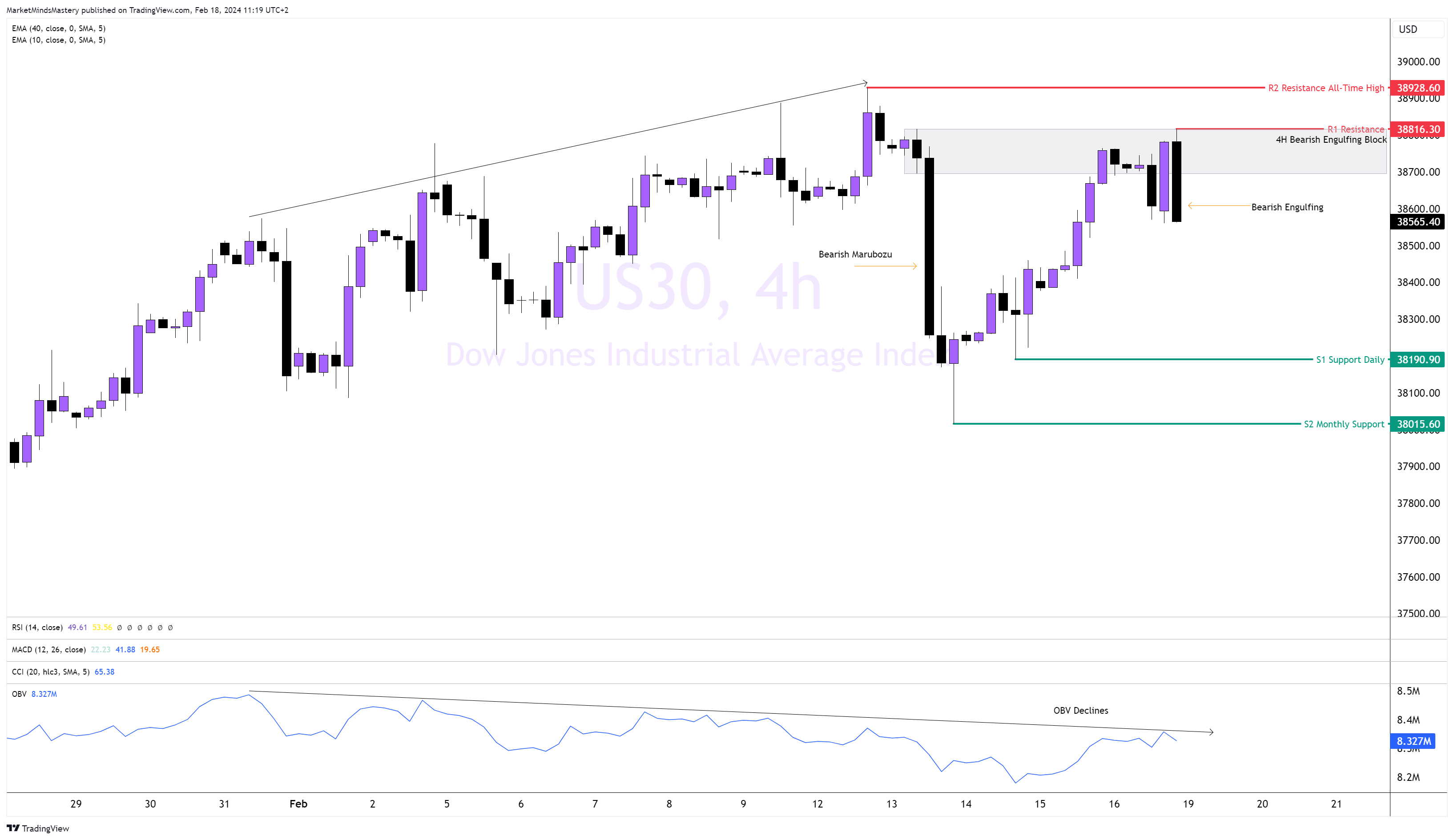 Following the surprising news events of last week, the price of the US30, on the 4H chart, printed a bearish marubozu candle. The price found support around the 38000 level and bounced upwards with a bullish reversal hammer. The price could not create a new all-time high, and the market sold off at the bearish engulfing block area between 38700 and 38800 last week. Since then, a long, bearish engulfing candle was created, indicating that the sellers were willing to defend that area. The (OBV) Balance Volume declines, showing that more money moves out of the market than money flows into the market. This is also a bearish indication. If the price moves lower, the first area of support, S1, is a daily low of approximately 38190. A close below it and a further decline will find the next level of support, S2, to be the previous month's low, around 38000. This round number can bring significant trading engagement as it is a round number and attracts attention. If the price bounces off and moves upwards, the first area of resistance, R1, is approximately 38800. If the price penetrates the R1 and moves higher, the next resistance area is the R2, around 38928, the all-time high price.