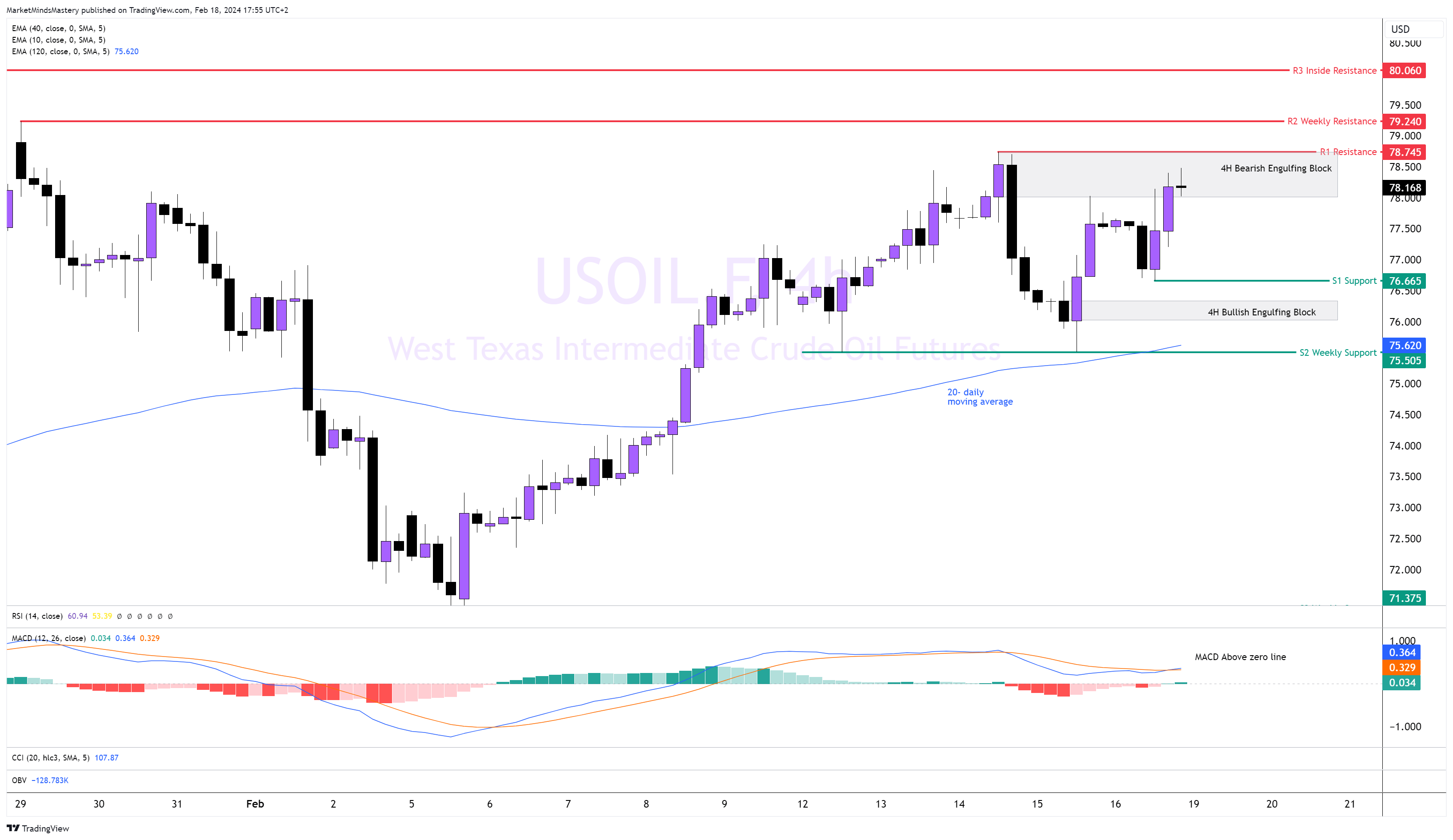 If the price moves upwards, the first resistance is the R1, which is around $78.74. If the price penetrates it and moves higher, the next resistance is the R2, a weekly level of approximately $79.20. A move beyond R2 can find the price reaching $80, which will be the R3 resistance area. On the other hand, if the price declines and moves downward, the first area of support, S1, is approximately $76.66. It is above the bullish engulfing block area between $76-76.30.