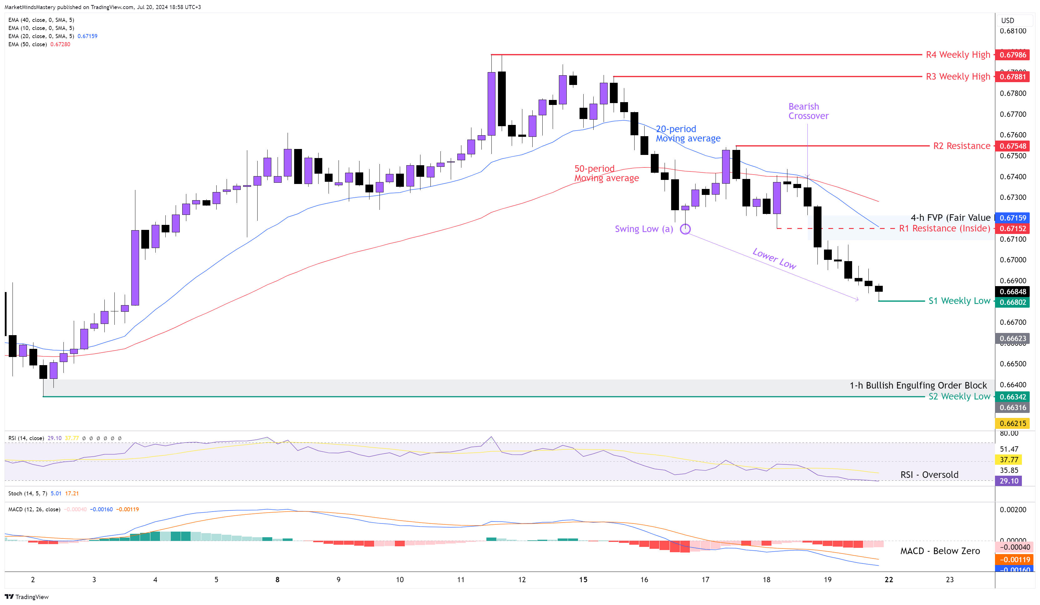 上周四澳大利亚失业率的上升是澳元走软的催化剂。此后,价格跌破了前一波段低点 (a),在周线图上形成了一根看跌长阳线,在 4 小时图上形成了一个更低的低点和一个更低的高点。值得一提的是,主要趋势(周线趋势)是向上的。如上图所示,RSI处于超卖状态,MACD低于零,其Histogram显示看跌柱形。这两种迹象都对澳元兑美元货币对产生了看跌影响。20周期和50周期移动平均线形成了看跌交叉,这也是看跌的。从下周一开始,如果价格继续下行,延续 4 小时的下跌趋势,那么第一个支撑区域 S1 将是前一周的低点,大约在 0.66802 附近。如果价格击穿 S1 并继续走低,下一个支撑区域 S2 将是另一个周低点,约 0.66342。在这一水平,7 月初形成了一个看涨吞没阶块,目前尚未测试。