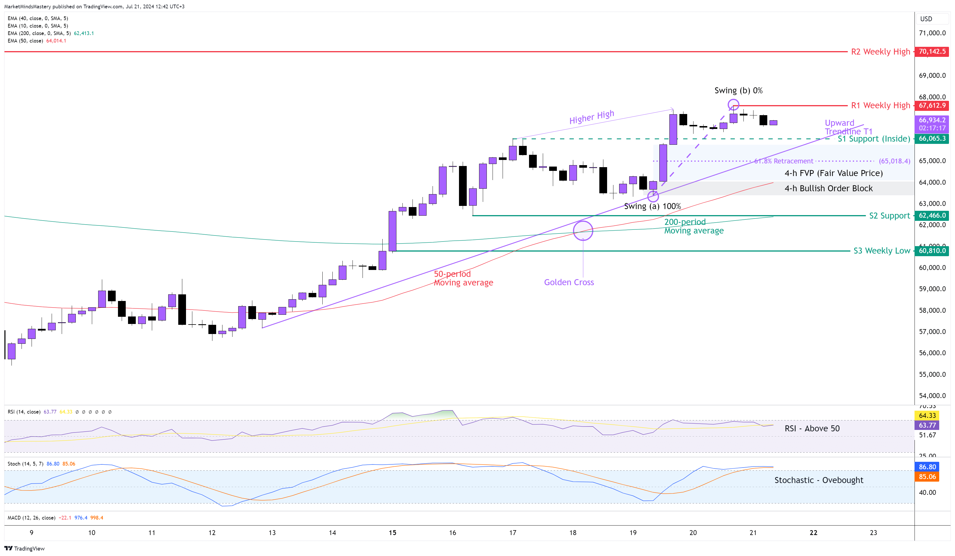 RSI 指标高于 50,这是一个看涨信号。随机指标处于超买状态,也是看涨迹象。从下周一开始,如果价格继续上行,第一个阻力区 R1 将是前一周的高点,约为 67612 美元。如果价格击穿 R1 并继续上升,下一个阻力区 R2 将是 70142 美元。