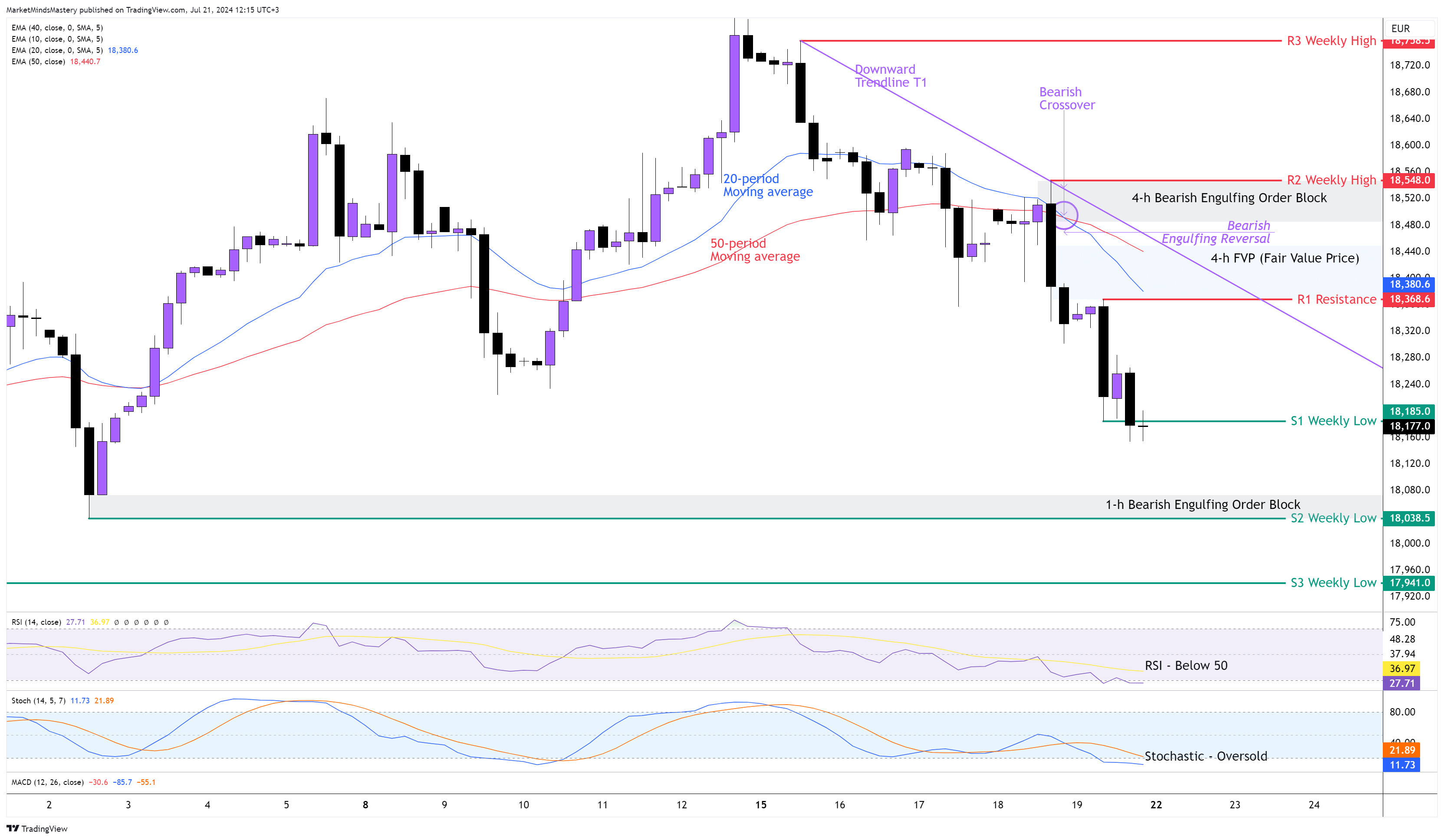 反之,如果价格找到支撑,反弹并上行,第一个阻力区域 R1 将在 18368 附近。如果价格击穿 R1 阻力并上行,下一个阻力区域 R2 将在 18548 附近。18548 附近的 R2 区域可视为一个重要区域,因为不久前在该区域形成了一个看跌吞没阶块,而且该区域尚未受到测试。如果价格击穿 R2 并继续上行,将形成新的市场结构。下一个阻力区 R3 约为 18758。