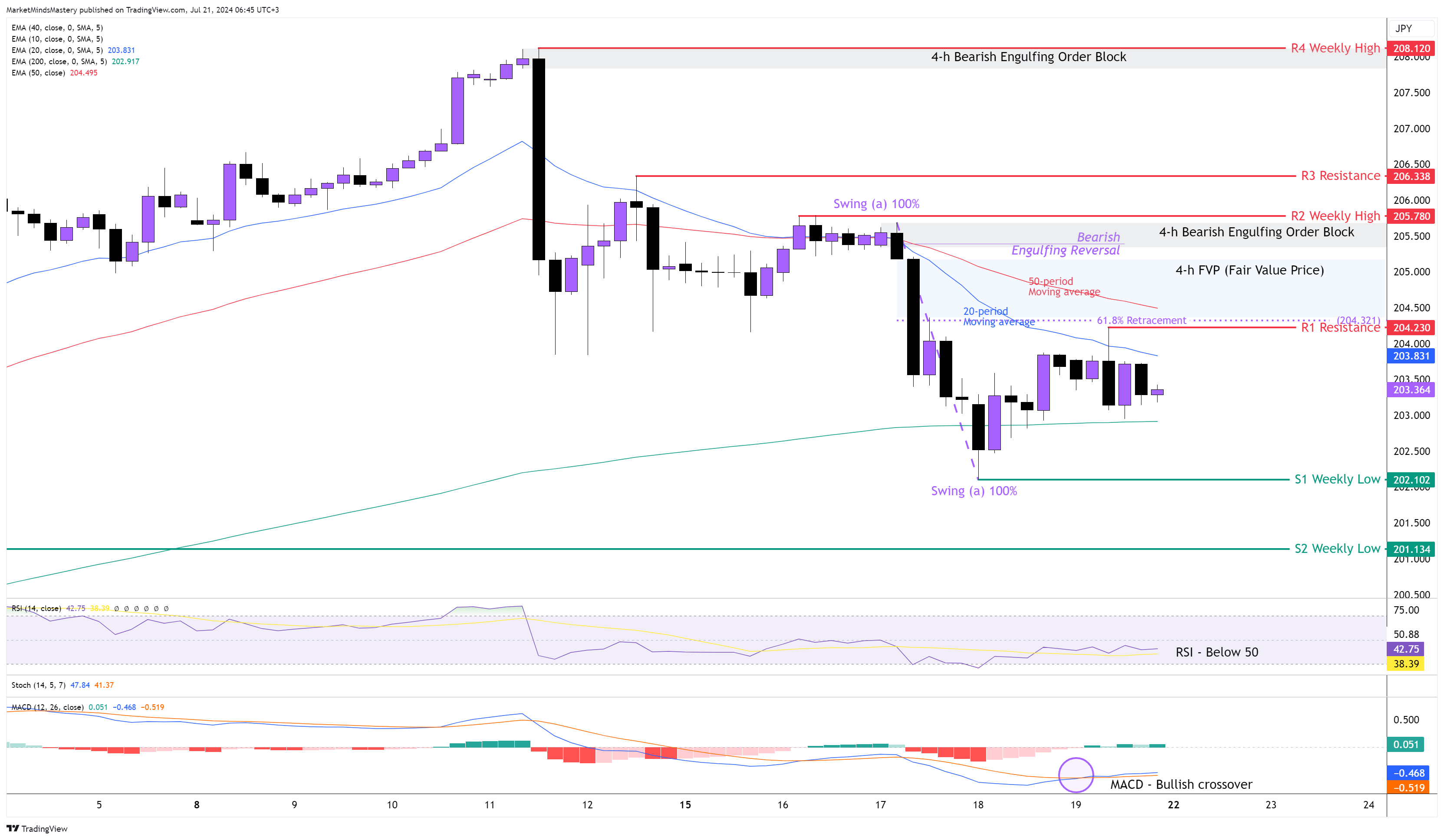 相反,如果价格找到支撑,反弹并上行,则第一个阻力区域 R1 将在 204.23 附近。在这个价位,有61.8%的斐波纳契回撤位、20 期移动平均线,它可以作为市场的动态阻力,以及FVP(公平价值价格)。所有这些都会在市场上吸引主要卖单。如果价格击穿 R1 并继续上行,下一个阻力区 R2 将是前一周的高点,约 205.78。这也是一个同样重要的价位,因为上周形成了Order Block。