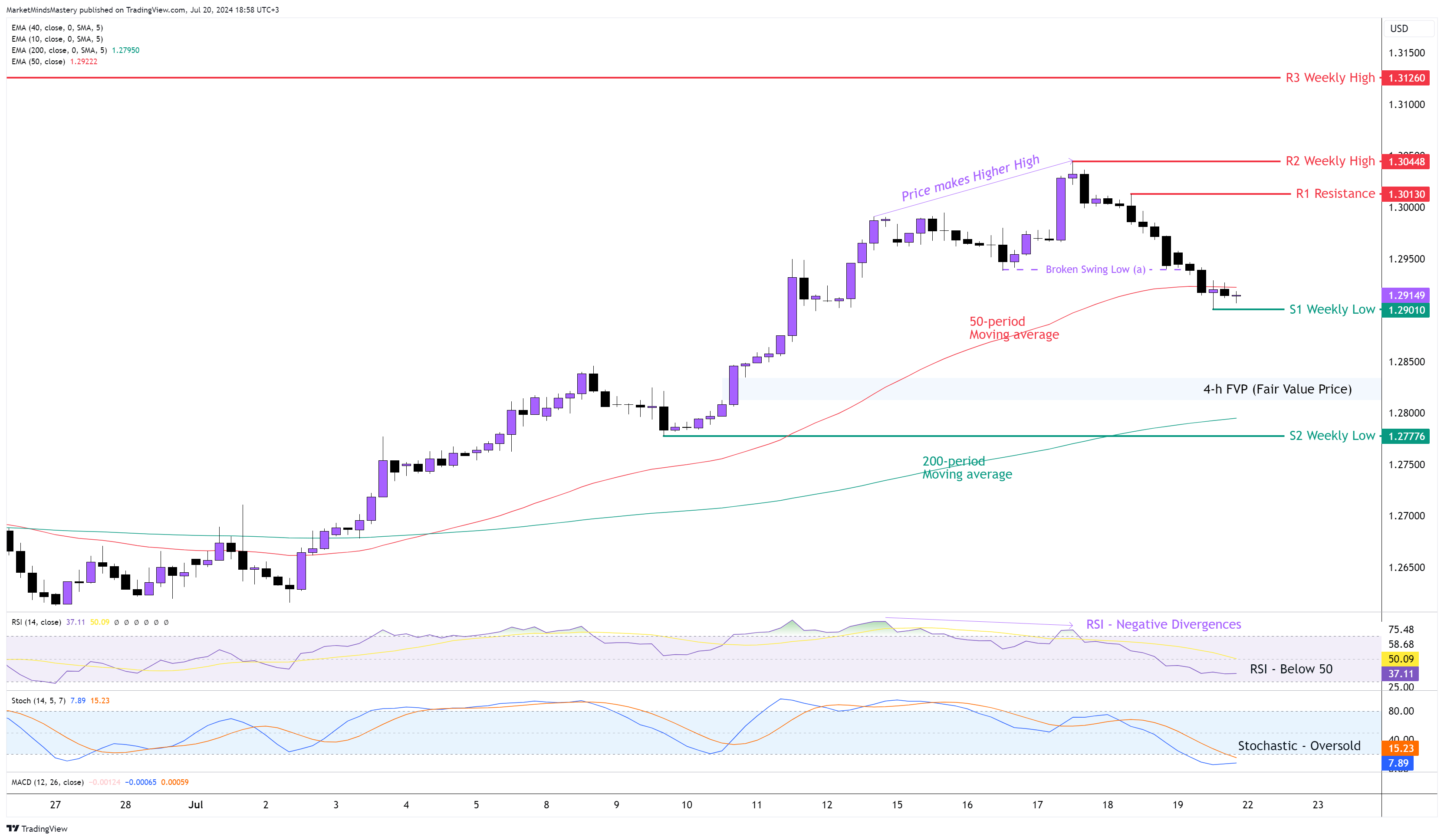 击穿了(a)点的震荡低点,结束了 4 小时上升趋势。但是,要形成下降趋势,价格需要创出更低的高点,而不仅仅是更低的低点。但是,这并不意味着价格不能在更高的时间框架内恢复看涨的上升趋势。这是两周来价格首次收盘低于50周期移动平均线。不过,50 期移动平均线高于 200 期移动平均线,这是看涨趋势。RSI低于50,表明货币势头向下。Stochastic振荡器处于超卖状态,这具有看跌含义。