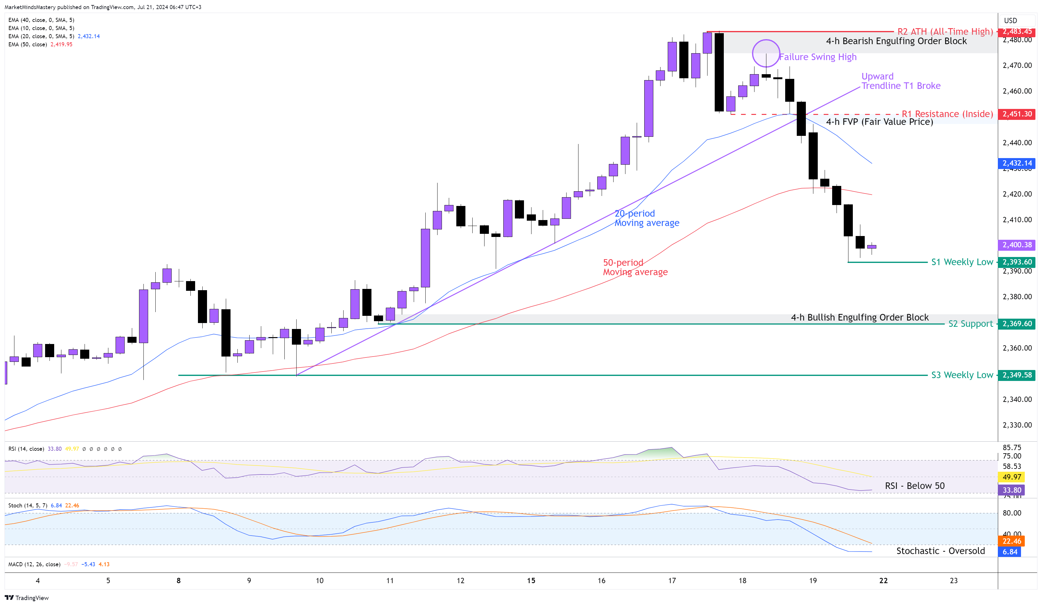 继前一周的上扬走势之后,上周三周线图上的黄金价格创下了ATH(历史新高)2483美元,到上周五,黄金价格下跌了约80美元。周线图显示了射击之星烛台,斯托克振荡器显示了负背离。这表明黄金价格可能会进一步下跌。在 4 小时图上,金价自上周四以来一直在下跌,图上只出现了看跌蜡烛图。根据摆动分析,有效上升趋势线 T1因失败摆动高点而告破,如图所示。我们标出了FVP(公平价值价格),它靠近趋势线的突破点,可以作为额外的阻力因素。虽然价格已经低于 20 期移动平均线和 50 期移动平均线,但这两条移动平均线还没有交叉,价格仍在下行。RSI低于 50,这是一个看跌迹象,Stochastic处于超卖状态,也是一个看跌迹象。从下周一开始,如果价格继续走低,第一个支撑区域将是前一周的低点,大约在 2393 美元附近。如果价格击穿 S1 并进一步下跌,下一个支撑区域 S2 将在 2369 美元附近。看涨吞没订单区位于同一水平。如果价格进一步下行,下一个支撑区域 S3 将在 2349 美元附近。相反,如果价格上行,则第一个阻力位 R1 将是 2451 美元附近的内侧阻力位。