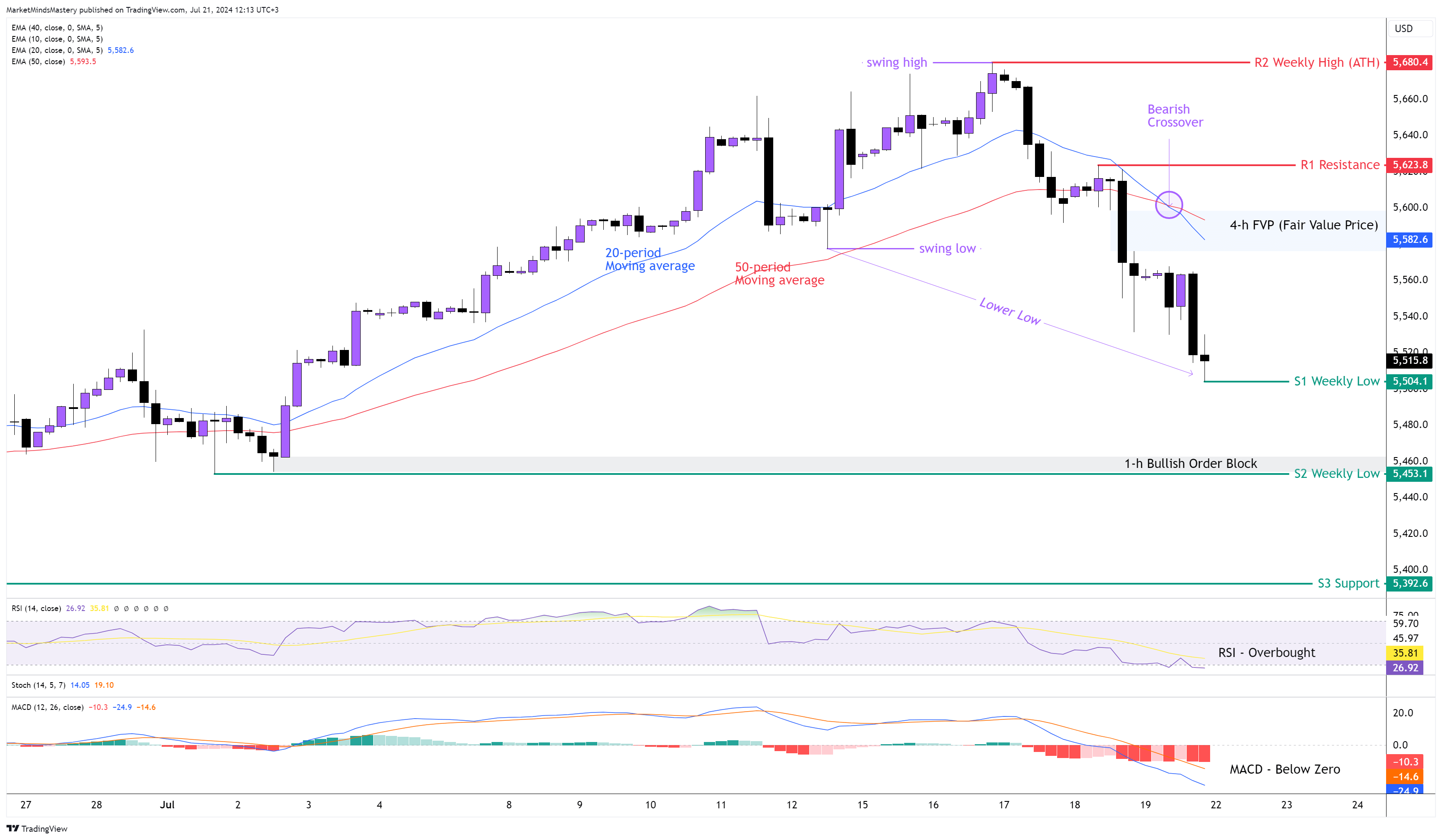 此外,柱状图显示,SP500 指数抛售强劲。如果从下周一开始,下跌势头持续下去,预计价格将继续走低,第一个支撑区域 S1 将是前一周的低点,约 5500 美元。这是一个整数,将吸引大量交易。如果击穿 S1 水平,价格继续下行,下一个支撑区域将是另一个周低点,即 S2,约 5453 美元。在这种情况下,月初形成的看涨订单区可以作为一个支撑因素。