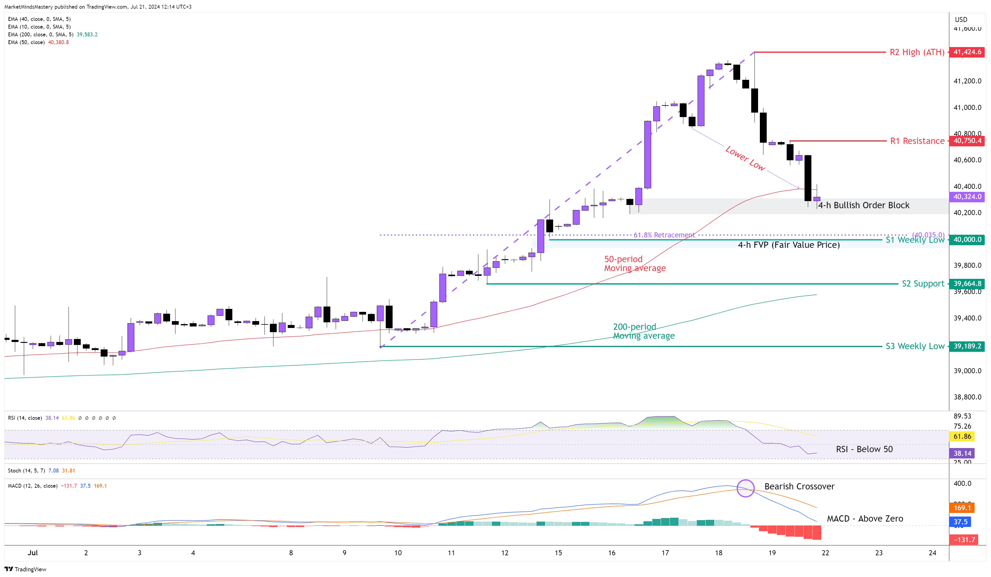 继上周 US30 指数上扬之后,价格创下了新的ATH(历史新高),但在周末,它又形成了射击之星反转蜡烛图形态。这意味着卖单战胜了买单,价格下跌。这是蜡烛图分析中最可靠的蜡烛图形态之一,因为它是在明确的上升趋势之后出现的。值得一提的是,周线图上的MACD并没有跟随价格上行,也没有创出新高。相反,它打印了负Diverneces A'class。4 小时图处于周线图的修正阶段。然而,市场结构的机会和第一个低点的形成表明市场存在看跌压力。如图所示,MACD仍高于零,但出现了看跌的交叉。RSI震荡指标低于 50,正处于超卖状态。50周期高于200周期移动平均线,这是看涨。移动平均线是趋势反转开始时的滞后指标。
