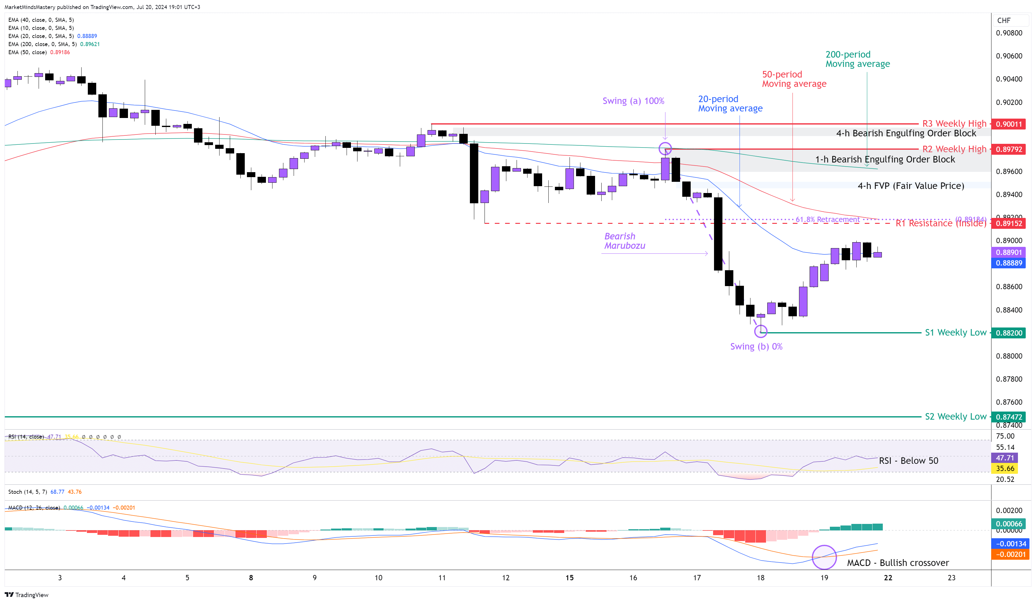 正如我们在图表中指出的那样,美元兑瑞郎的价格在 7 月初开始下行后,于上周三在 Bearish Marubozu 蜡烛突破前一周低点后创下了新低和新高。