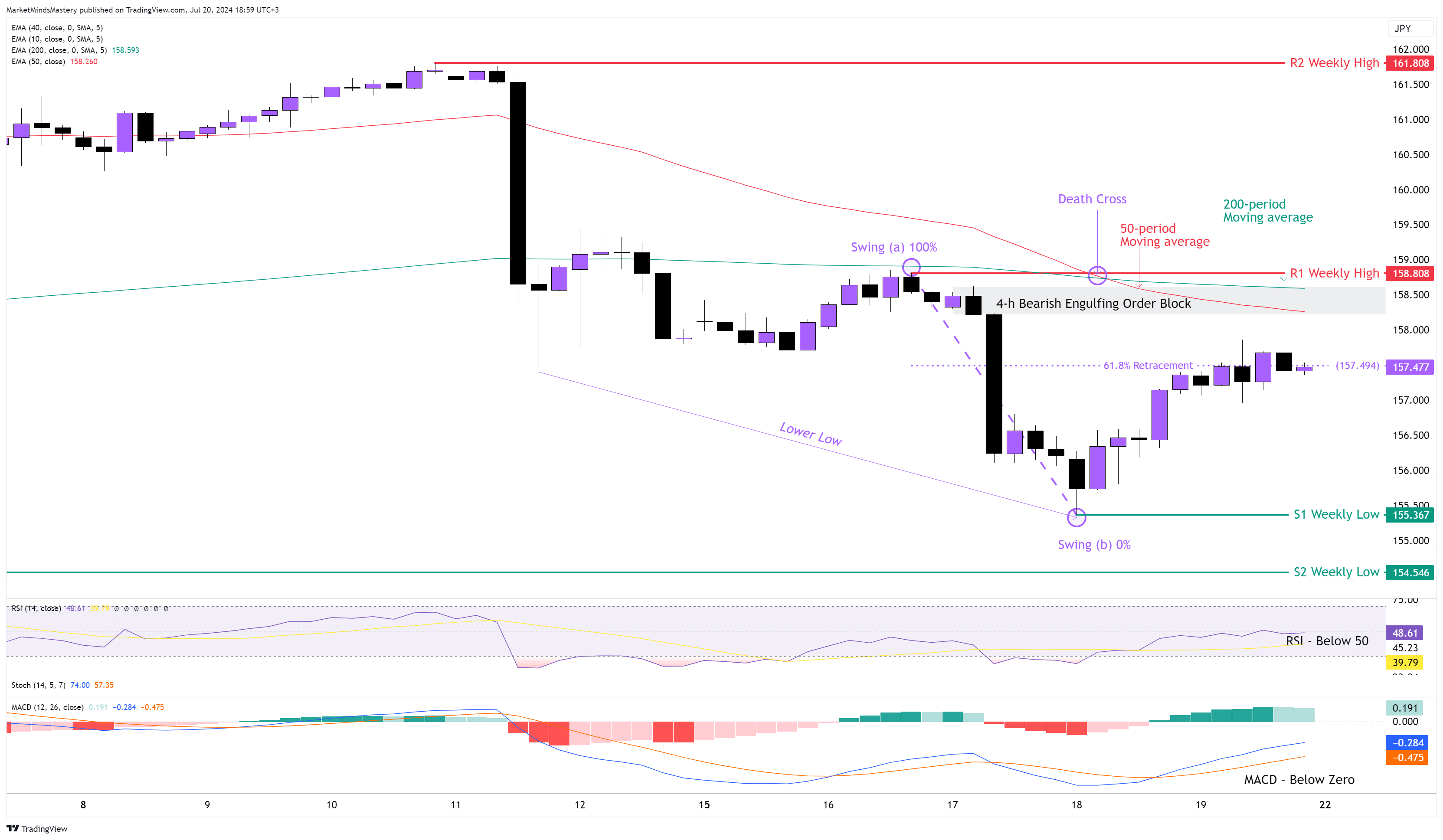 此外,MACD低于零线,这也是看跌信号。目前,价格位于黄金分割率的61.8%Fibonacci附近。如果价格在此区域发现阻力并下跌,则可能会向下移动,直至上周低点,即 S1 支撑位 155.367 附近。如果价格击穿 S1 并继续走低,那么下一个支撑区域将是另一个周低点,约 154.546。另一方面,如果价格继续上行,但未找到 61.8% 阻力位,那么第一个阻力区域 R1 将是前一周的高点,约 158.808。该价位被认为具有重要意义,因为它与 200期移动均线共存,可以作为动态阻力位,以及启动上一次价格冲动性波动的4-H 看跌吞没阶块。如果价格没有停留在 R1 下方,如果价格击穿 R1 并继续上行,那么当前的下跌趋势将结束,周线主升趋势将恢复。在这种情况下,下一个阻力区域 R2 将非常接近 ATH(历史高点),大约在 161.808。