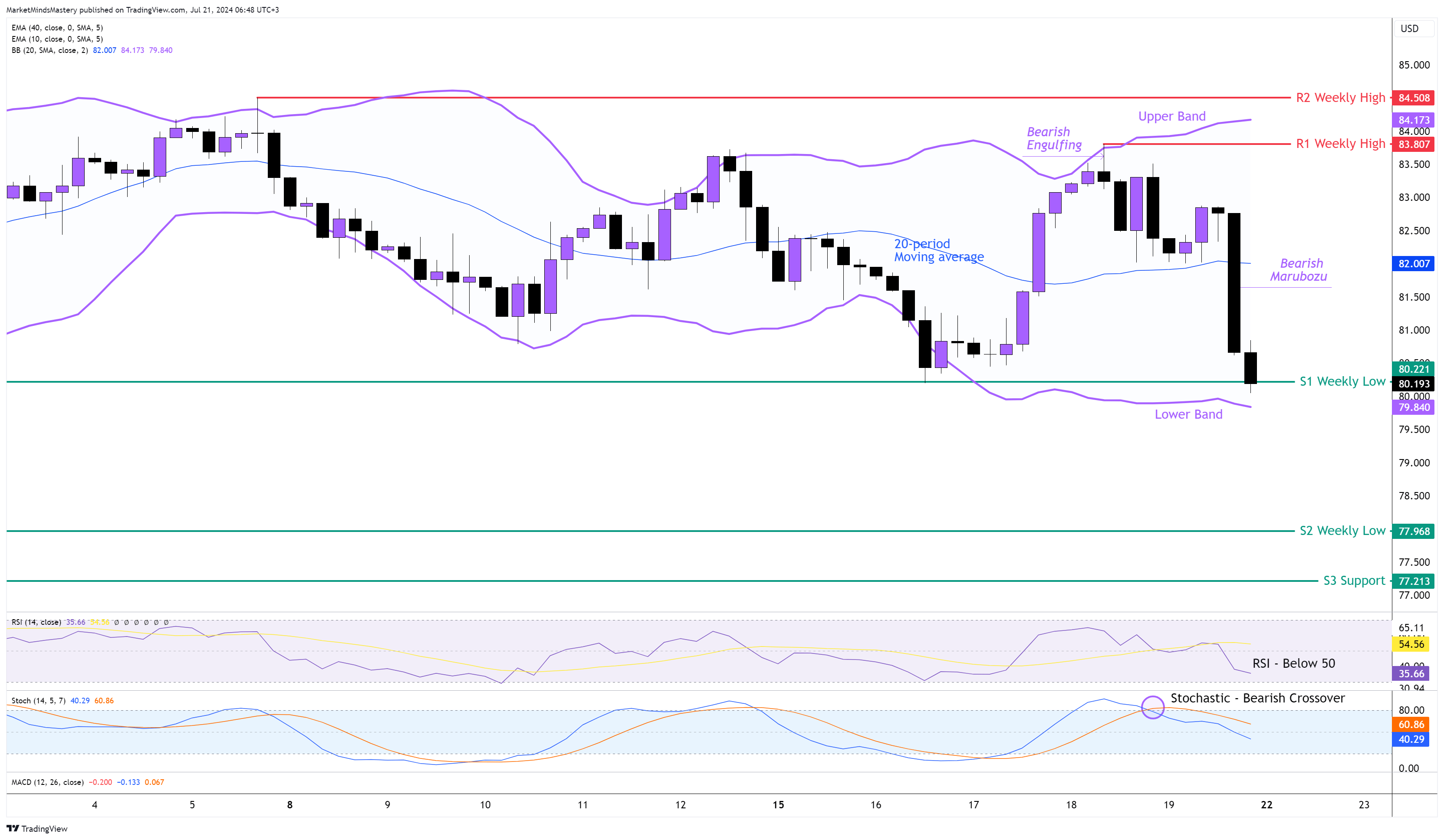 从周一开始,如果价格在下波段找到支撑,反弹并上行,第一个阻力区R1将是上一周的高点上波段附近,即83.80美元。如果价格击穿 R1 并继续上扬,那么下一个阻力区 R2 就会近在咫尺,它将到达另一个周内高点 84.50 美元。另一方面,如果价格跟随周价格走势继续下行,那么第一个支撑区域 S1 将是前一周的低点,大约在 80.24 美元,也就是当前价格所在的位置。如果价格击穿 S1 并继续走低,那么下一个支撑区域 S2 将是 77.96 美元。
