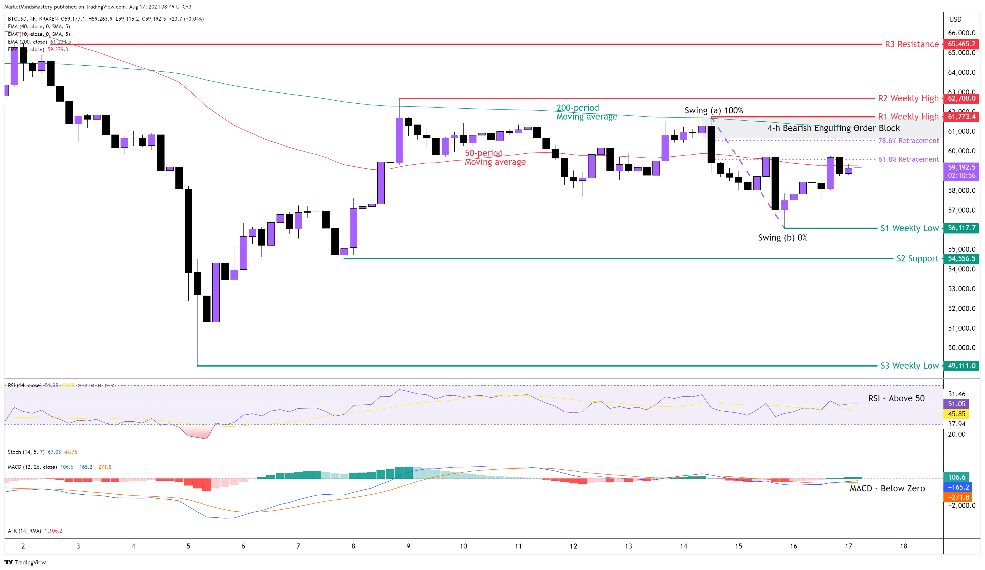 另一方面,MACD i低于其零线,这意味着卖单和买单之间的不平衡更倾向于卖出一方。上周五,价格回撤了从摆动高点(a)到摆动低点(b)的61.8%。61.8% 斐波那契或 "黄金比例 "与略低于60000 美元的50 期移动平均线共存。因此,如果价格被拒绝并向下移动,第一个支撑区域 S1 将位于 56117 美元附近,这也是前一周的低点。如果价格击穿 S1 并继续走低,下一个支撑区域 S2 将是 54556 美元。