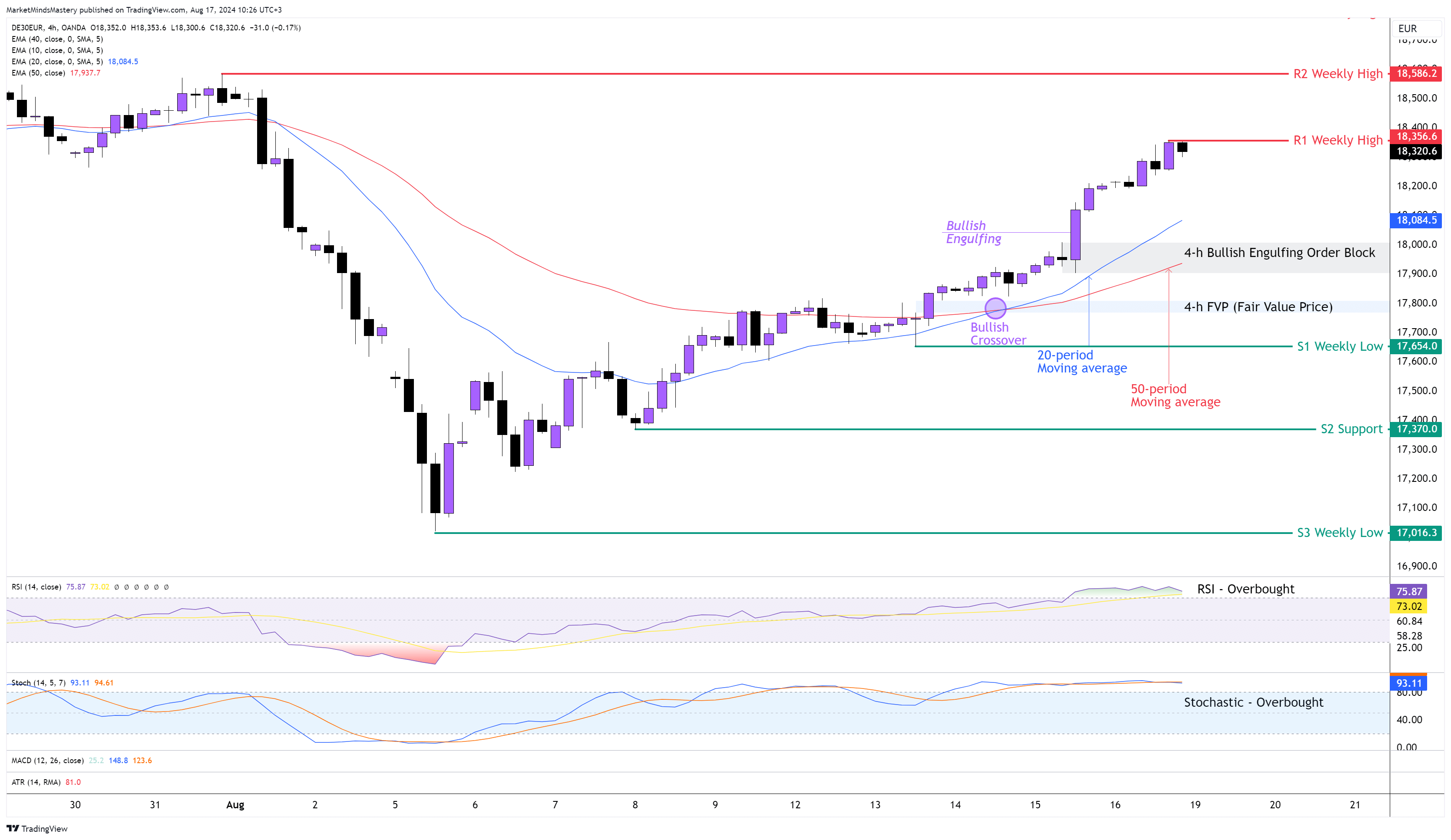 GER30 的价格上周一路上扬,周蜡烛图以看涨的 Marubozu结束。在 4 小时图上,价格持续上涨,创出更高的高点和更高的低点,没有任何回调。大多数蜡烛看涨,只有少数蜡烛看跌。这是强劲上升趋势的标志。周三,出现了看涨交叉,这意味着20周期移动平均线越过了50周期。此后,RSI和Stochastic摆动指标都进入了超买状态。由于波段高点尚未得到确认,我们无法使用斐波那契回调工具来绘制上一次冲动性上行的回调水平。