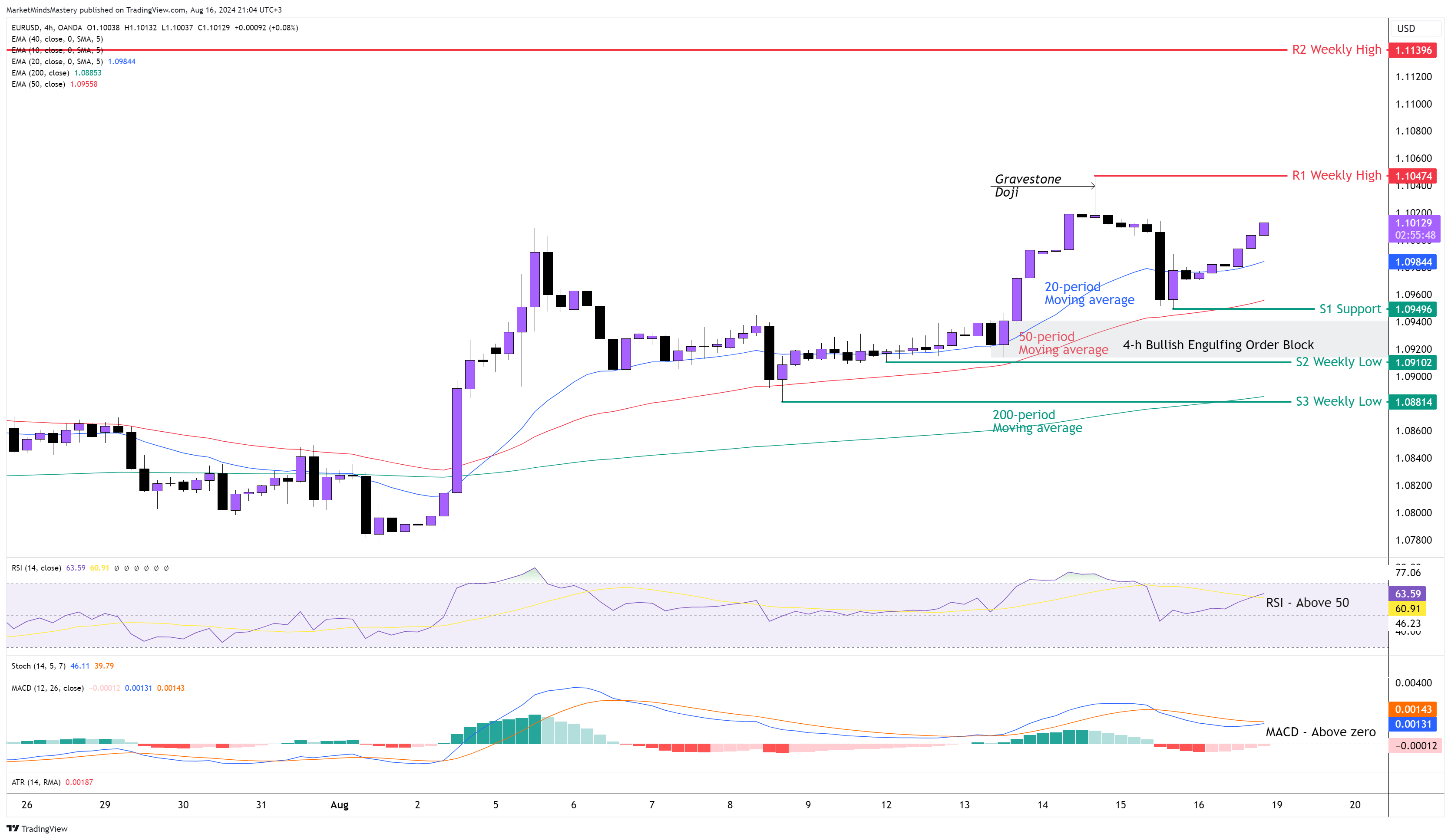 上周《市场展望》周线图中显示的 "十字星 "蜡烛图,在主要上升趋势的内容中,并没有导致价格下行。相反,价格跟随主市场方向上行。按照 4 小时图的上升趋势,价格持续上涨,并于上周三在重要阻力位 1.10000上方创出了新高。20周期移动平均线位于50周期移动平均线上方。50 期移动平均线位于200 期移动平均线上方,看涨。RSI振荡器位于中线50上方。MACD位于零线上方,具有看涨含义。