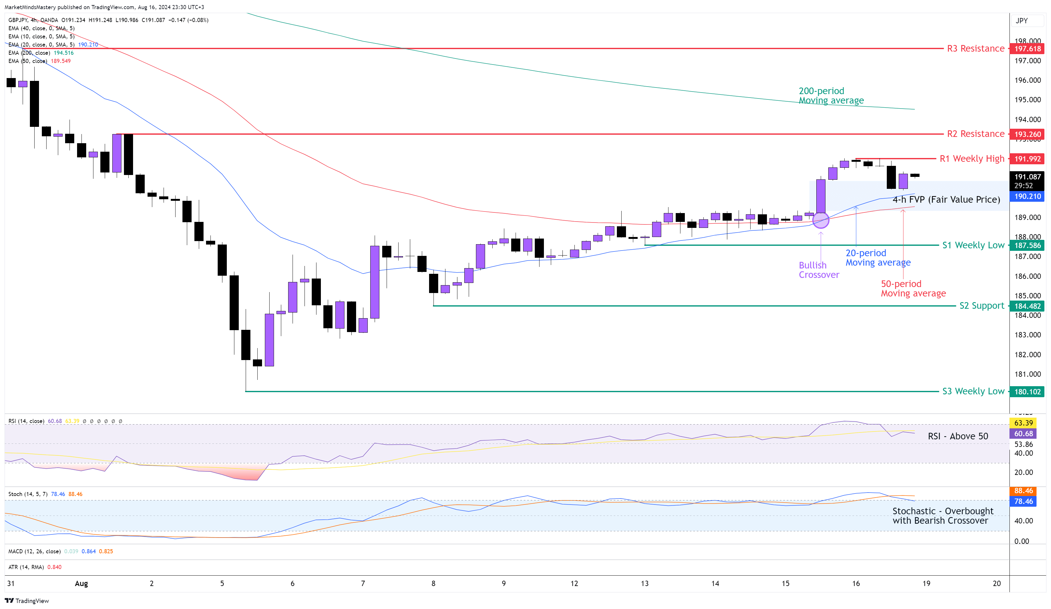 继前一周的市场展望之后,英镑兑日元货币对的价格如期上扬,这是因为周线蜡烛图上出现了具有看涨含义的 "长下翼"(Long Lower Wick)。在 4 小时图上,价格创造了一系列更高的高点和更高的低点。因此,20 期移动平均线越过50 期移动平均线,如上图看涨交叉标志所示。RSI位于50中线上方,表明市场看涨。另一方面,Stochastic 振荡器在超买状态下形成了 B看跌交叉。这通常意味着价格可能开始进入修正阶段。目前,价格进入了FVP(公平价值价格),并在反弹时用作支撑。从下周一开始,如果价格继续上行,第一个阻力区域 R1 将是前一周的高点,大约在 191.992 附近。如果价格击穿 R1 并继续上升,下一个阻力区域 R2 将是 193.26。如果继续上行,下一个阻力区 R3 将在 197.618 附近。