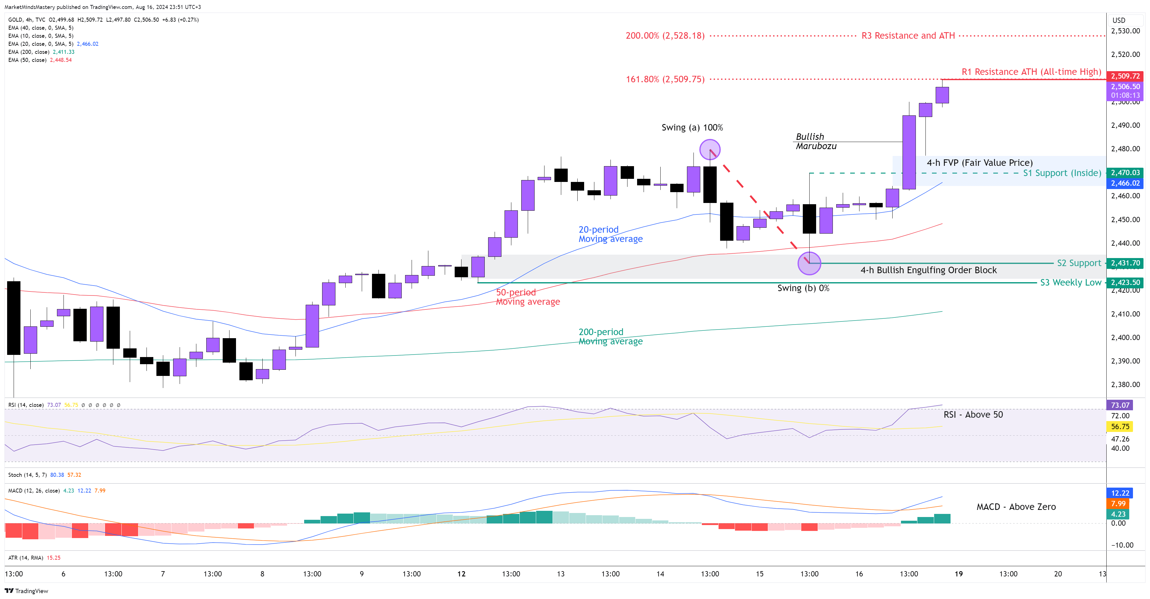 从下周一开始,如果价格继续上行,第一个阻力区 R1 将是前一周的高点和 ATH,大约 2509 美元。如果价格继续上涨并突破 R1 水平,下一个阻力区 R2 将在 2528 美元左右。如上图所示,这是200%斐波那契延伸线。