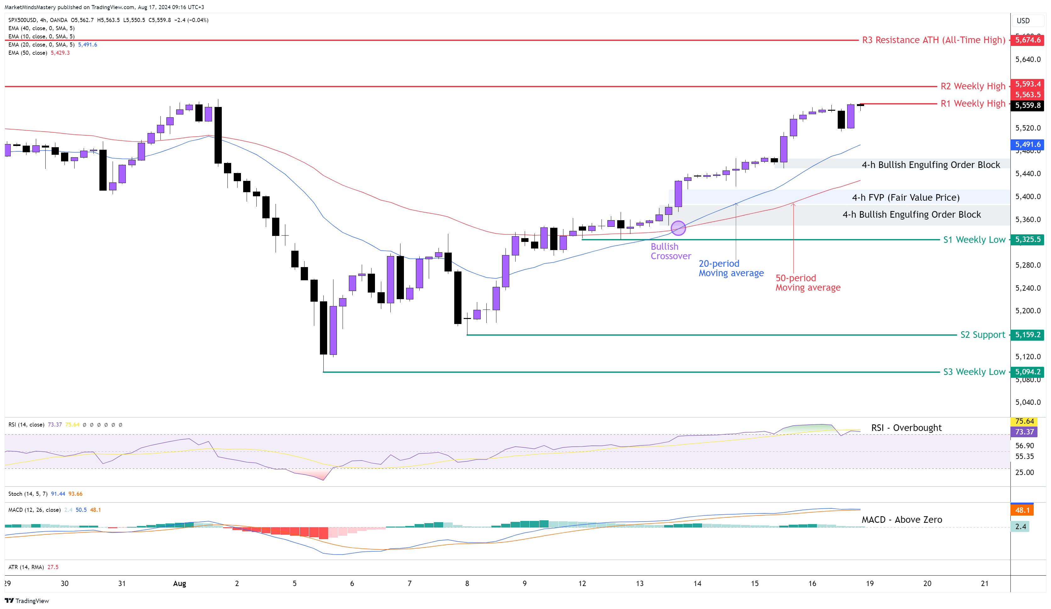 继前一周的市场展望之后,SP500 指数的价格如期上扬。周线图蜡烛图中的长下引线导致价格上行,形成了看涨丸楮。在 4 小时图上,根据波动分析,市场形成了更高的高点和更高的低点的市场结构。当两个时间框架的方向一致时,市场通常会提供高概率的交易机会。上周二,20周期在50周期移动平均线上方交叉,被称为看涨交叉。从那时起,价格在该时间框架内直线上升,没有回调任何部分的上升趋势。因此,RSIOSCillator 进入了超买状态,因为它移动到了上边界线 70 以上。MACD移动到零线上方,具有看涨含义。此外,MACD 的柱状图位于零线上方。上周二,在$5350附近形成看涨吞没订单区;上周四,在$5460附近形成看涨吞没订单区;