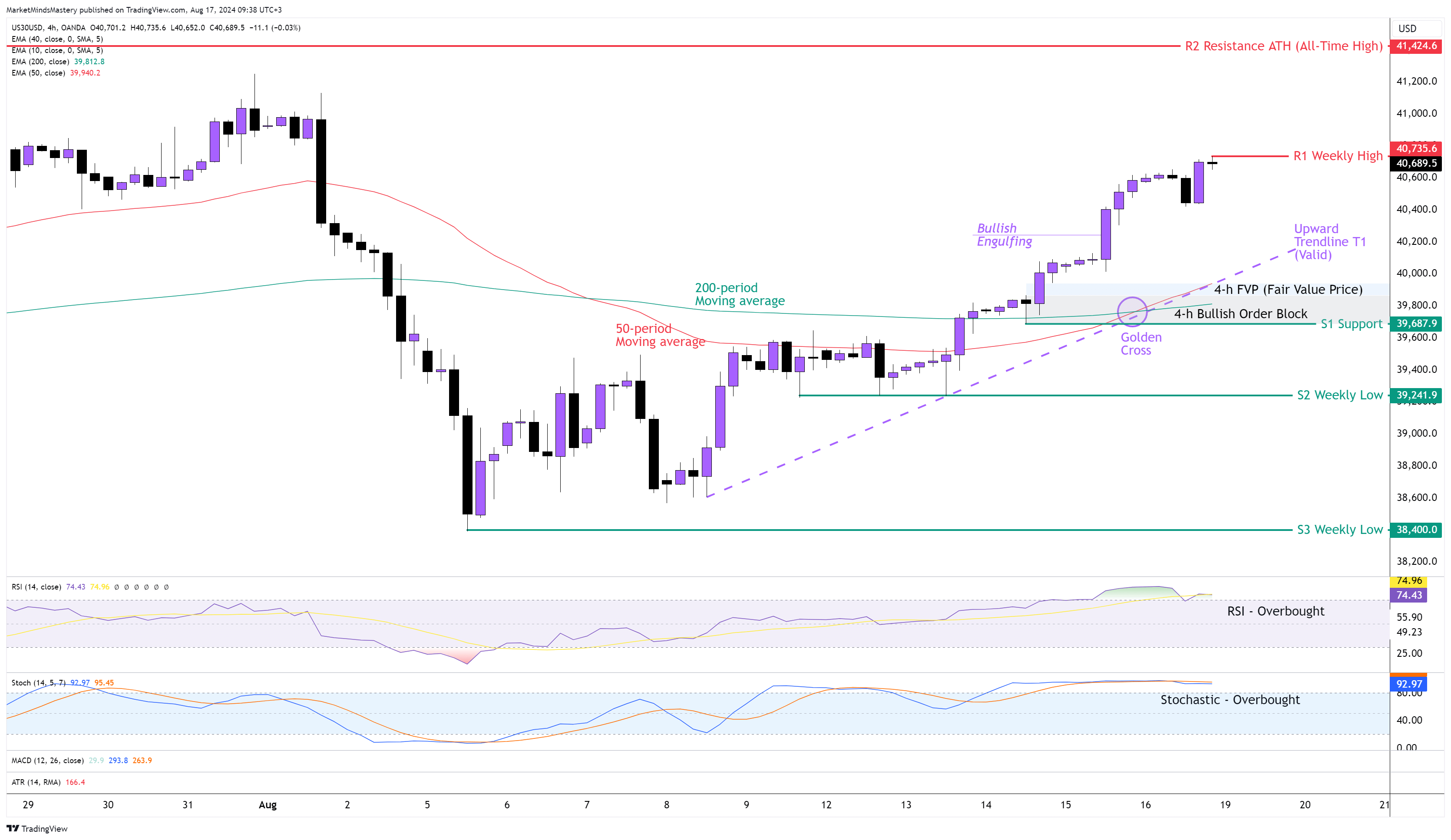 US30 是上周表现良好的指数之一,为日间交易者提供了交易机会。在周线市场结构和看涨反转价格行动的引领下,市场主要通过买单的累积而波动。周线蜡烛图以看涨蜡烛图收盘,这显示了市场的看涨力量。在 4 小时图上,价格创造了一系列更高的高点和更高的低点。根据波动分析,浅回调显示了市场的强势。上周五,50 期移动平均线越过200 期移动平均线,被称为"金叉"。RSI移动到 70 以上,成为超买。Stochastic振荡器也处于超买状态,表明看涨。由于价格图表上没有确认的波动高点,我们无法使用斐波纳契回调工具来预测回调百分比。因此,从周一开始,如果价格继续上行,第一个阻力区域 R1 将是前一周的高点,约 40735 美元。如果价格击穿 R1 并继续上升,下一个阻力区域 R2 将是ATH(历史高点)41424 美元。
