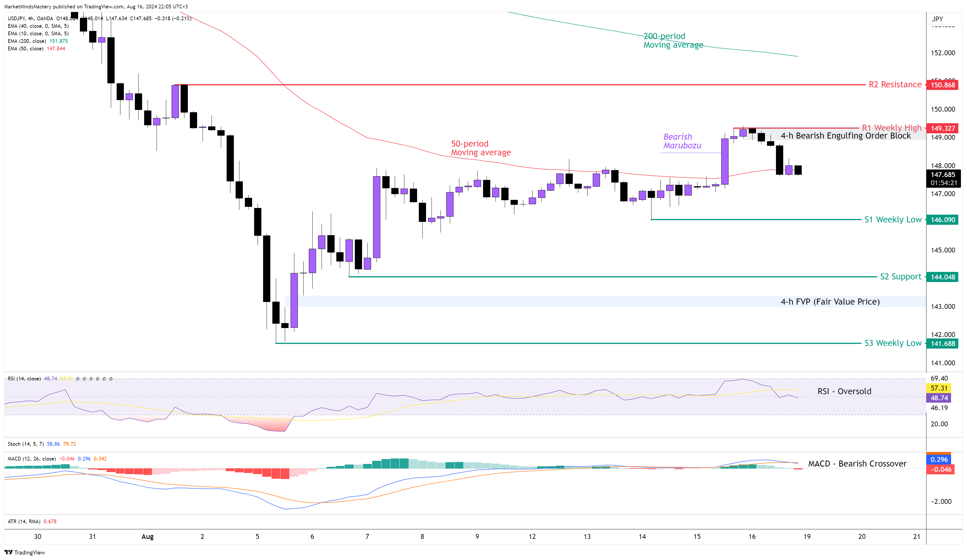 在周线图上出现看涨针形柱(类似于龙飞烛台)之后,价格有望在大量成交的情况下上扬,但事实并非如此。相反,价格仅上涨了约 100 点。这表明市场疲软推动价格上行,也许买单不足以支撑更高的价格。在 4 小时图上,50-period低于20-period,这是看跌。RSI位于中线 50 附近。MACD在零线上方形成看跌交叉,这通常具有看跌含义。MACD的柱状图移动到零线下方,这表明价格开始下跌。从本周一开始,如果价格进一步下跌,第一个支撑区域 S1 将是前一周的低点,即 146.090 附近。如果价格击穿 S1,下一个支撑区域 S2 将在 144 附近,S3 将在 141.688 附近,这是一个旧的周低点。在 143.000 附近,有一个 "未减弱的 "FVP(公平价值价格)。相反,如果价格反弹并上行,第一个阻力区 R1 将是前一周的高点,即 149.327 附近。在这一水平附近,上周市场形成了一个看跌吞没阶块,可为价格提供额外的阻力。如果价格击穿 R1 并继续上升,下一个阻力区域 R2 将是 150.868。