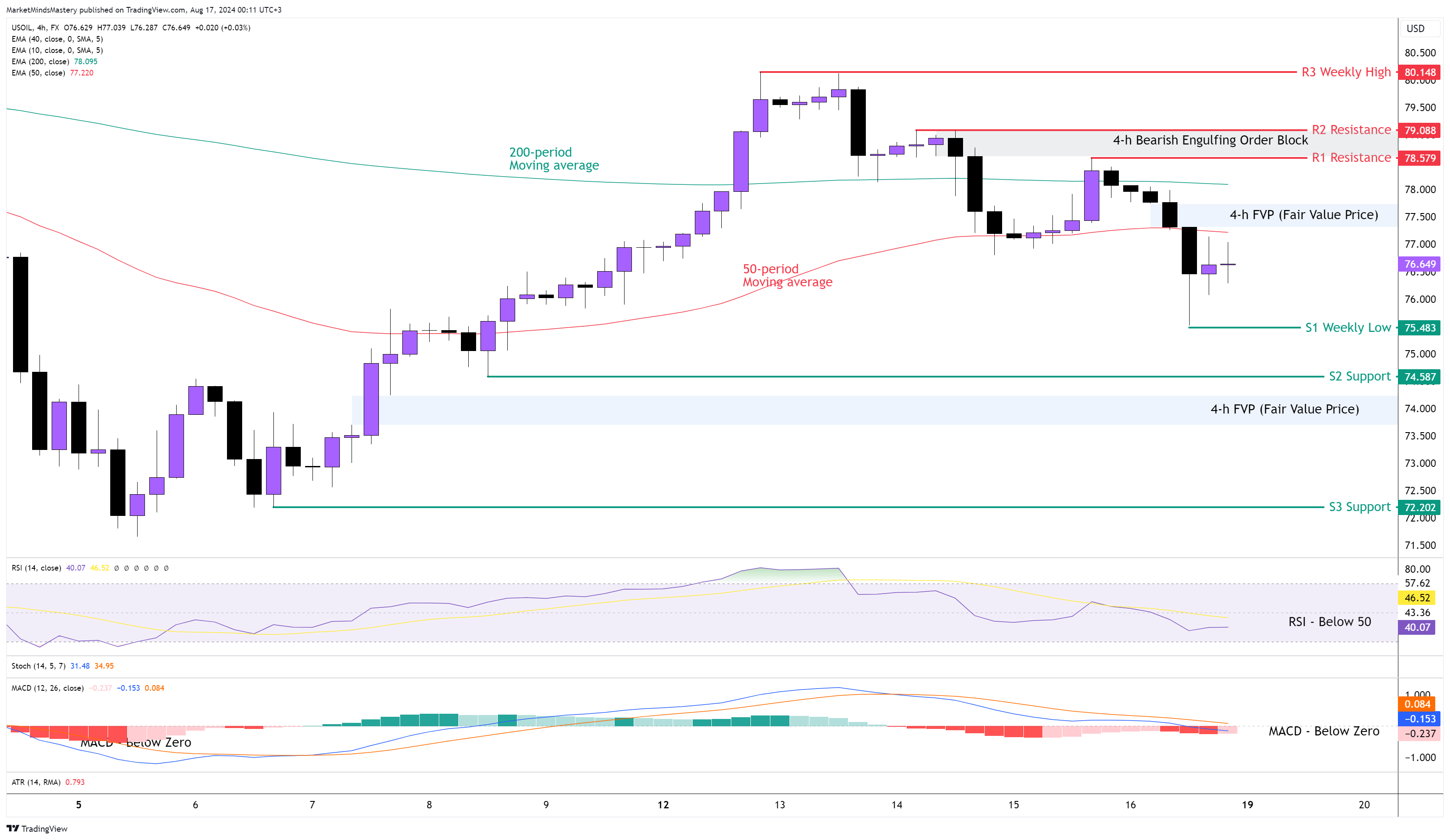 虽然周线图上没有明确的趋势,而且10周期低于40周期周移动平均线(我们没有在上图中显示),但这被认为是看跌迹象。周线图上的价格以看跌反转蜡烛图收尾,带有长上引线和小实体。在 4 小时图上,价格形成了一系列较低的高点和较低的低点,这被视为看跌迹象。50周期移动平均线低于200周期移动平均线,这是看跌信号。另一个看跌暗示是RSI低于中线50,MACD低于零线。此外,自上周三以来,MACD的Histogram一直处于零线以下。上周,该价格在 79 美元附近形成了一个看跌吞没订单区,在 77.50 美元附近形成了一个FVP(公允价值价)。最近几根蜡烛图的收盘价低于 50 期移动平均线。因此,如果价格继续下跌,第一个支撑区域将在 75.48 美元左右,也就是前一周的低点。如果价格跌破 S1 并继续走低,下一个支撑区域 S2 将是 74.58 美元。如果价格击穿 S2 并继续下行,下一个支撑区域 S3 将在 72.20 美元附近。相反,如果价格反弹并上行,第一个阻力区 R1 将在 78.57 美元附近。突破 R1 水平后,下一个阻力区 R2 将在 79.088 美元附近,下一个阻力区 R3 将在 80.148 美元,即前一周的高点。