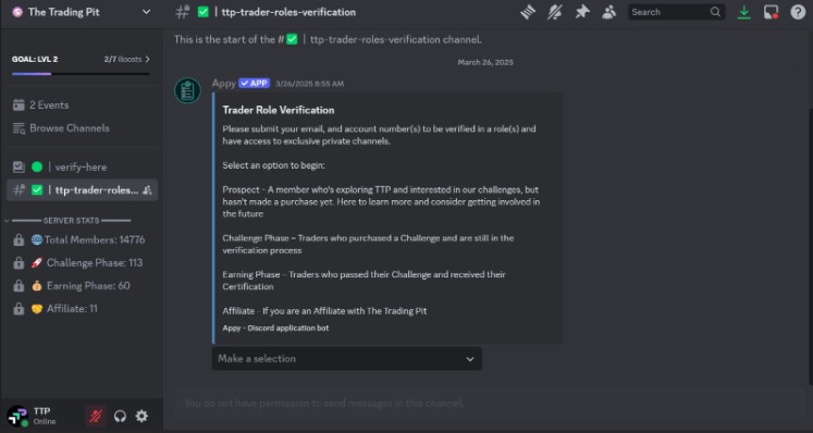 验证完成后,您将进入 ✅︱ttp-trader-roles-verification 频道,在这里您可以通过下拉式菜单选择以下的其中一个身份:Prospect、Challenge Phase、Earning Phase 或 Affiliate。
