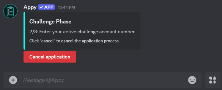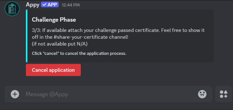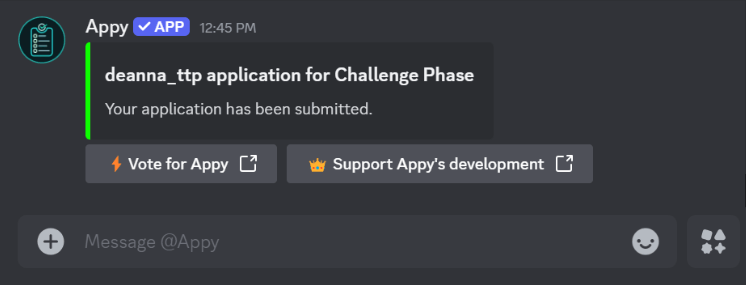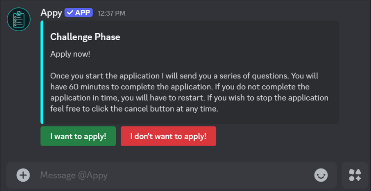 根据您选择的身份,Appy Bot 会通过私信向您确认是否要提交申请。点击绿色按钮以确认。一旦您确认申请,Appy Bot 将提出 1 到 3 个问题让您回答。