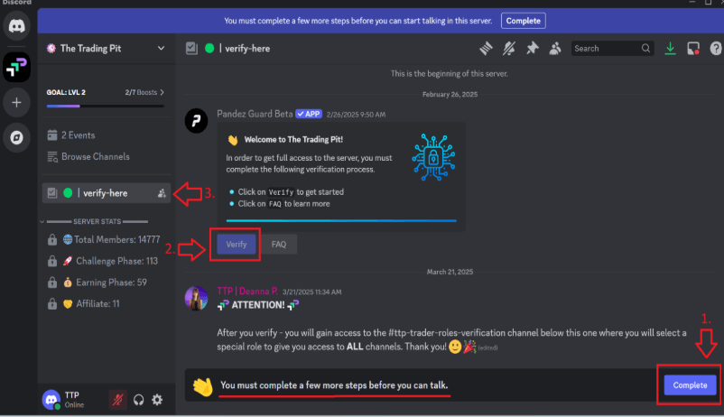 加入后,您需要在频道 #🟢︱verify-here 中完成我们的验证流程。此步骤能保障社区安全,确保只有真实用户能获得访问权限。完成验证后,您将获得 “Verified” 身份,解锁主要频道供您探索。